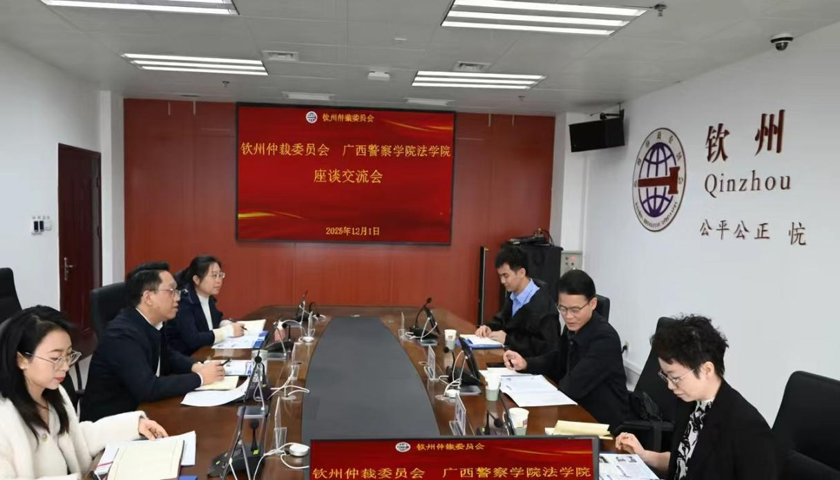 2025年12月1日,学院党总支书记唐连荣、国际经贸规则专业负责人邓珊、辅导员郑凯赴钦州市开展访企拓岗活动。上午唐连荣一行三人抵达钦州市仲裁委与钦州市仲裁委秘书处秘书长陈戈锐、钦州市司法局政治部主任陆庆秋、钦州市仲裁委综合部主任章白露进行座谈。