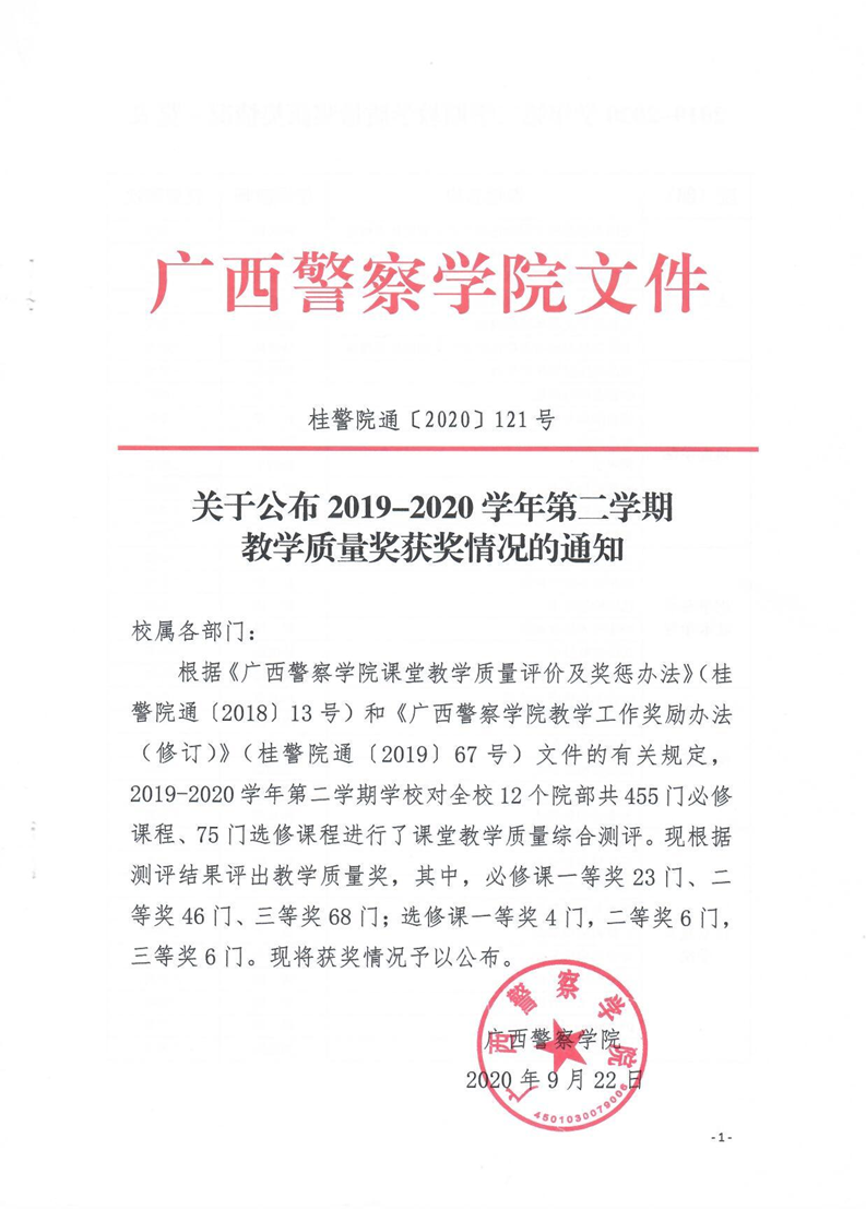关于公布2019-2020学年第二学期教学质量奖获奖情况的通知