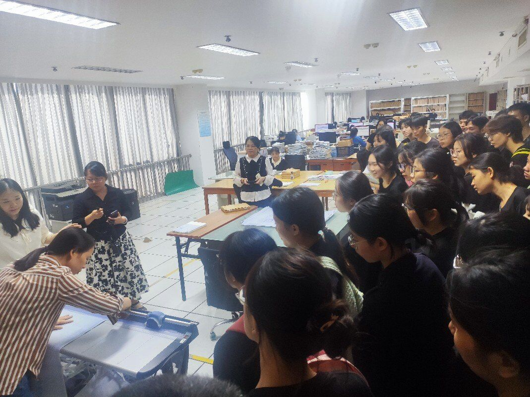 参观了规划展示馆之后,同学们移步至相邻的城市建设档案馆。怀着对档案的好奇之心,同学们在档案馆档案编研室韦金良副主任和业务指导科韦艳兰科长的带领下,又开始了全新的探索。同学们在档案馆探寻城市历史的墨宝书香,感受深厚的档案文化,了解严谨的档案业务。同学们看到了南宁城市建设的文献、照片、实物和声像档案,一下子就拉近了与历史的距离,让人感觉档案是有温度的、是立体的,一下子灵动起来。同学们亲身体验档案整理及数字化加工的过程,在查阅接待大厅观看工作人员对档案查询和利用的实际操作,对城市建设档案有了更深入和具体的了解。最后,城建档案馆馆长黄平友、副馆长黄刊与师生进行了互动交流和合影留念,同学们非常期待馆长受邀来校开展专题讲座。