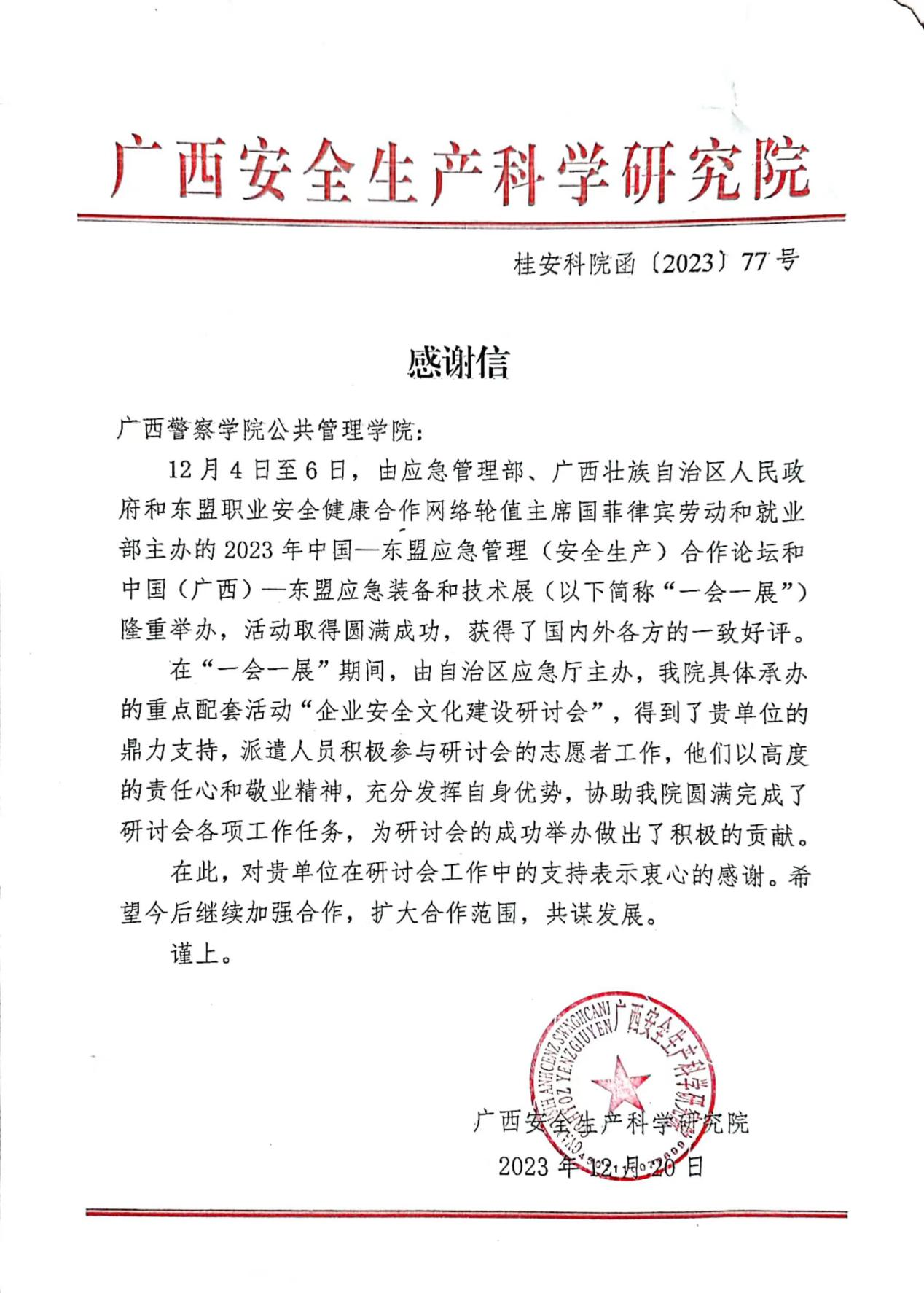 紧接着,广西安全生产科学研究院副院长曾觉发对我院雷慧娴等27名学生对今年"一会一展"期间,主动服务"企业安全文化建设研讨会"的志愿活动,表示感谢!赞扬这批学生在活动中表现优秀,得到了很多与会者的赞叹,并当场送上感谢信。