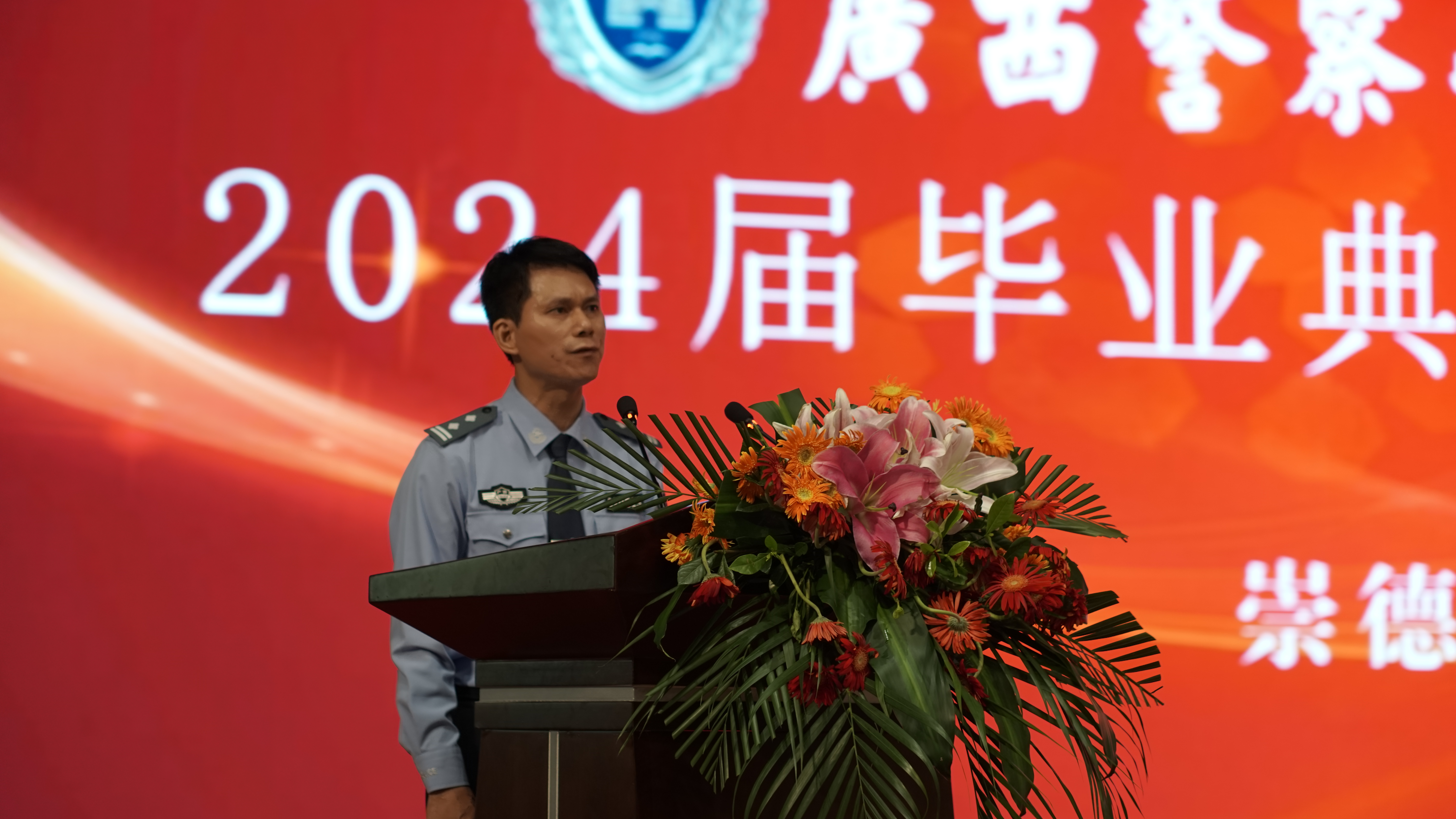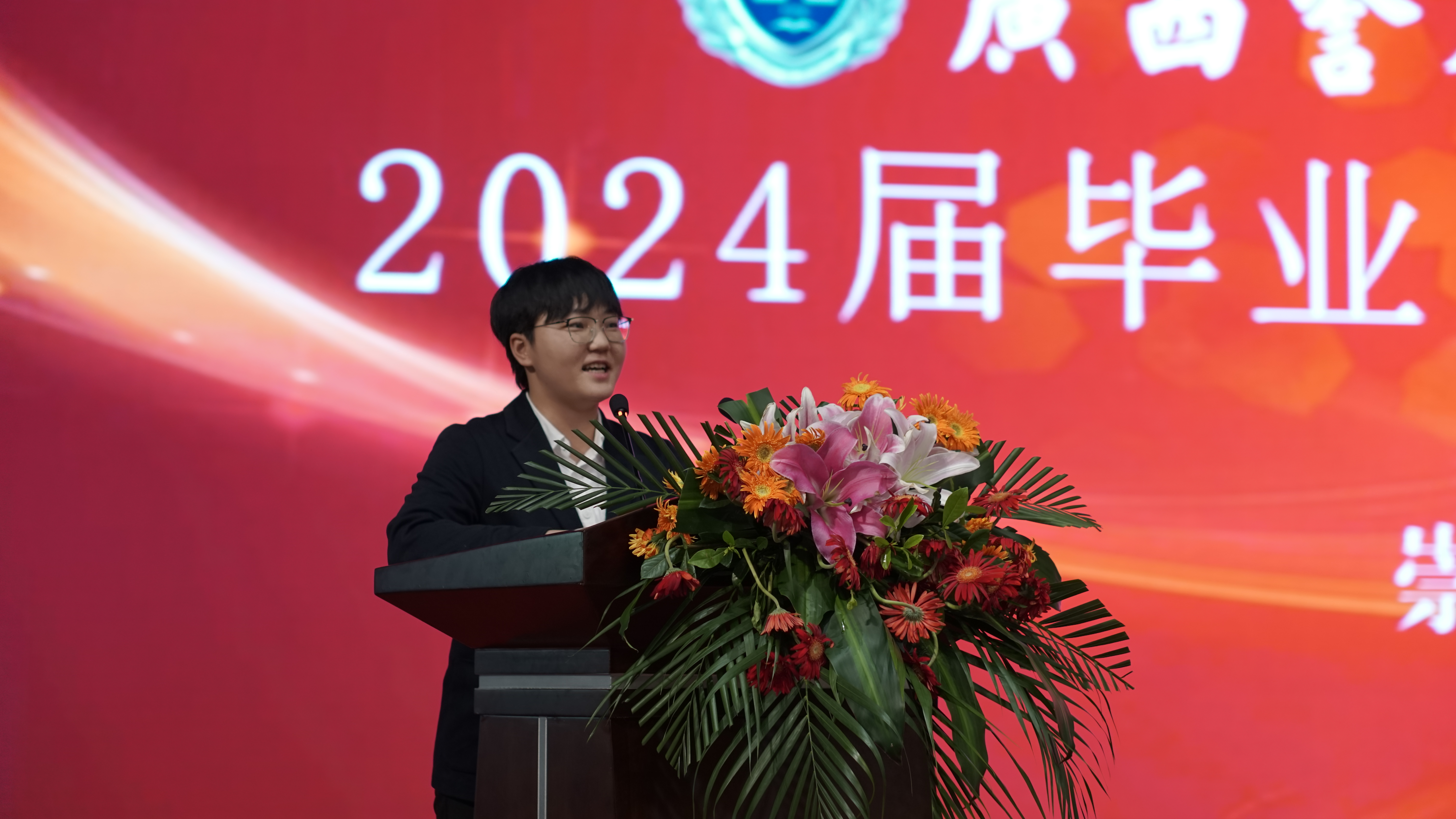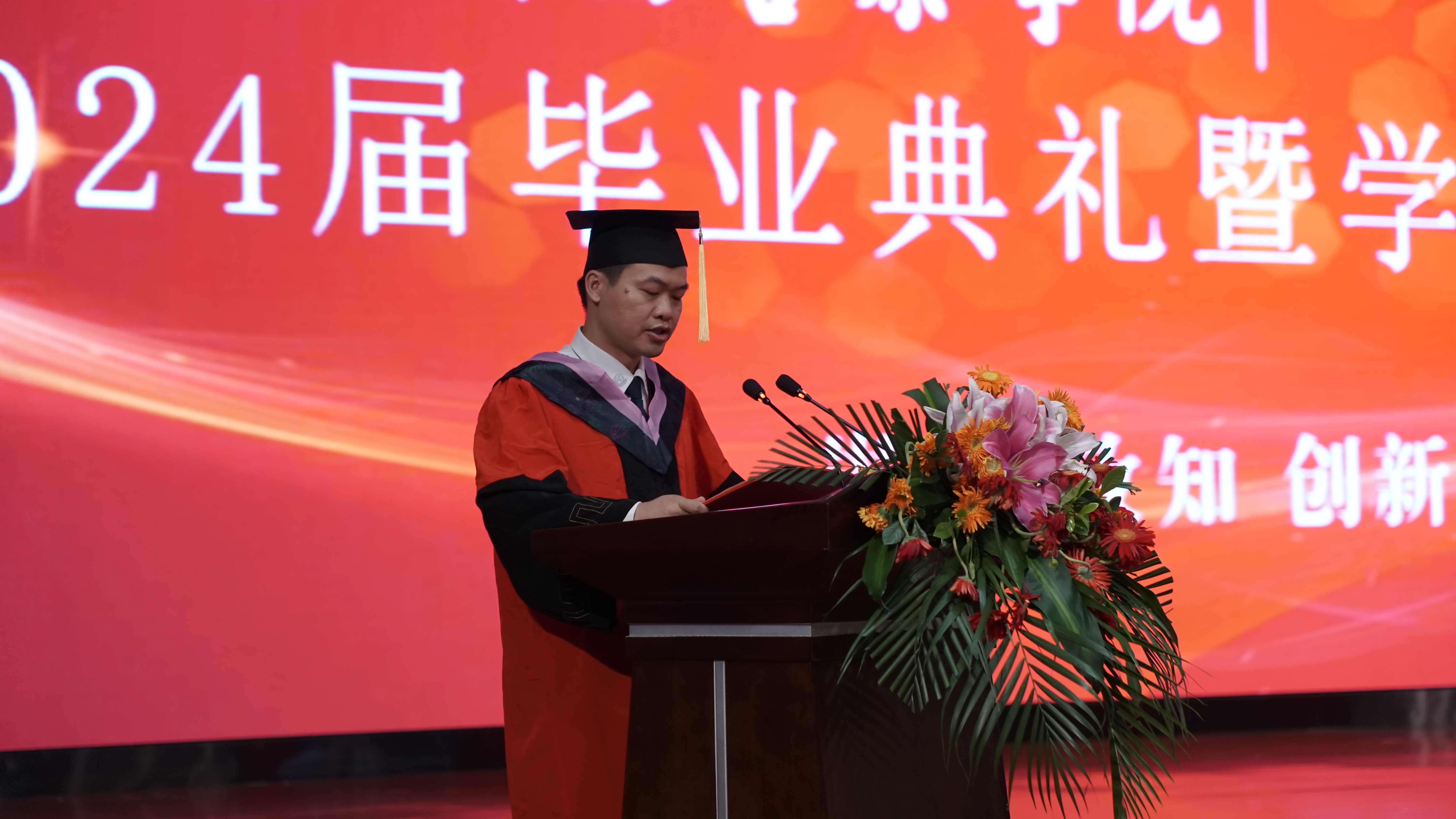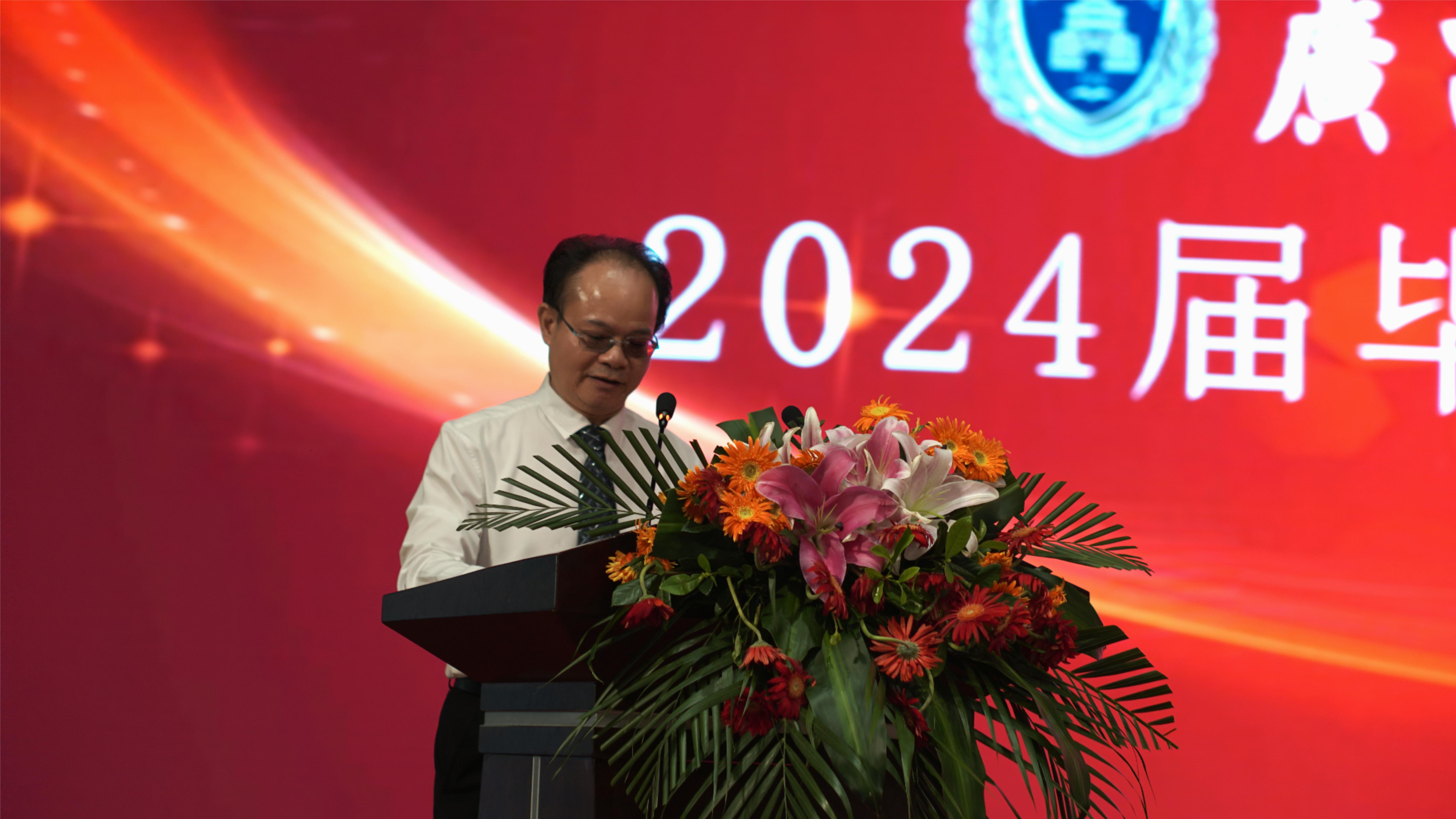 在毕业典礼上,黄朝成院长在致辞中向学有所成的全体同学表示热烈的祝贺!向一路辛勤培育的老师和关心支持的家长,表示崇高的敬意和衷心的感谢!他回顾了与2024届毕业生共同见证和参与的难忘经历,并寄语毕业生在新时代中国特色社会主义伟大的建设中:一是要初心如磐不松劲,争当强国有我的担当者;二是要昂扬向上不滑坡,争当崇德修身的笃行者;三是要使命在肩不懈怠,争当壮美广西的建设者。