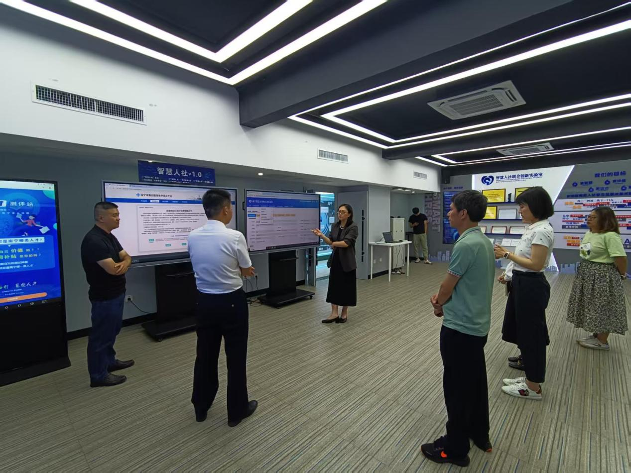 在智慧人社联合创新实验室,调研组深入了解数字化社保服务平台和系统,该实验室作为全国社保数字化改革的标杆,展示了智能服务系统、区块链技术应用、风险监测平台多项创新成果。谢副局长介绍,实验室通过整合多个旧系统、联通各个政府部门数据,实现了“一网通办”,其经验已在全国推广。社保卡办副主任杨明介绍了智慧人社系统的建设成果,包括V1.0阶段的“惠企服务免申即办平台”“智慧人才一体化服务”等特色应用,以及V2.0升级后推出的“灵活用工数字化服务”“劳动维权一体化平台”“人社立体化智能风控”“跨省通办”等创新平台及功能。谢副局长重点介绍了通过实时数据分析实现风险动态管控和处置的真实案例。