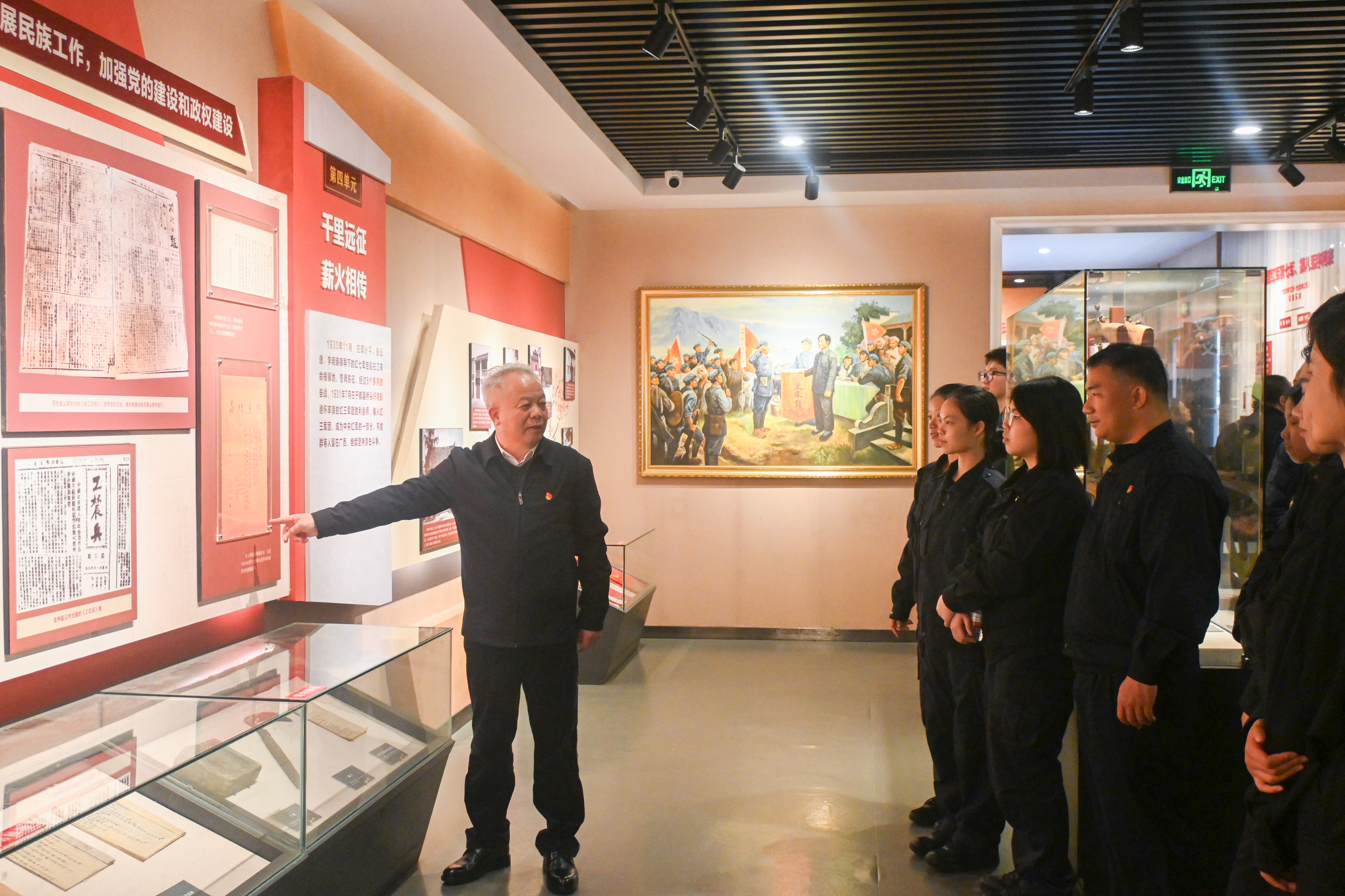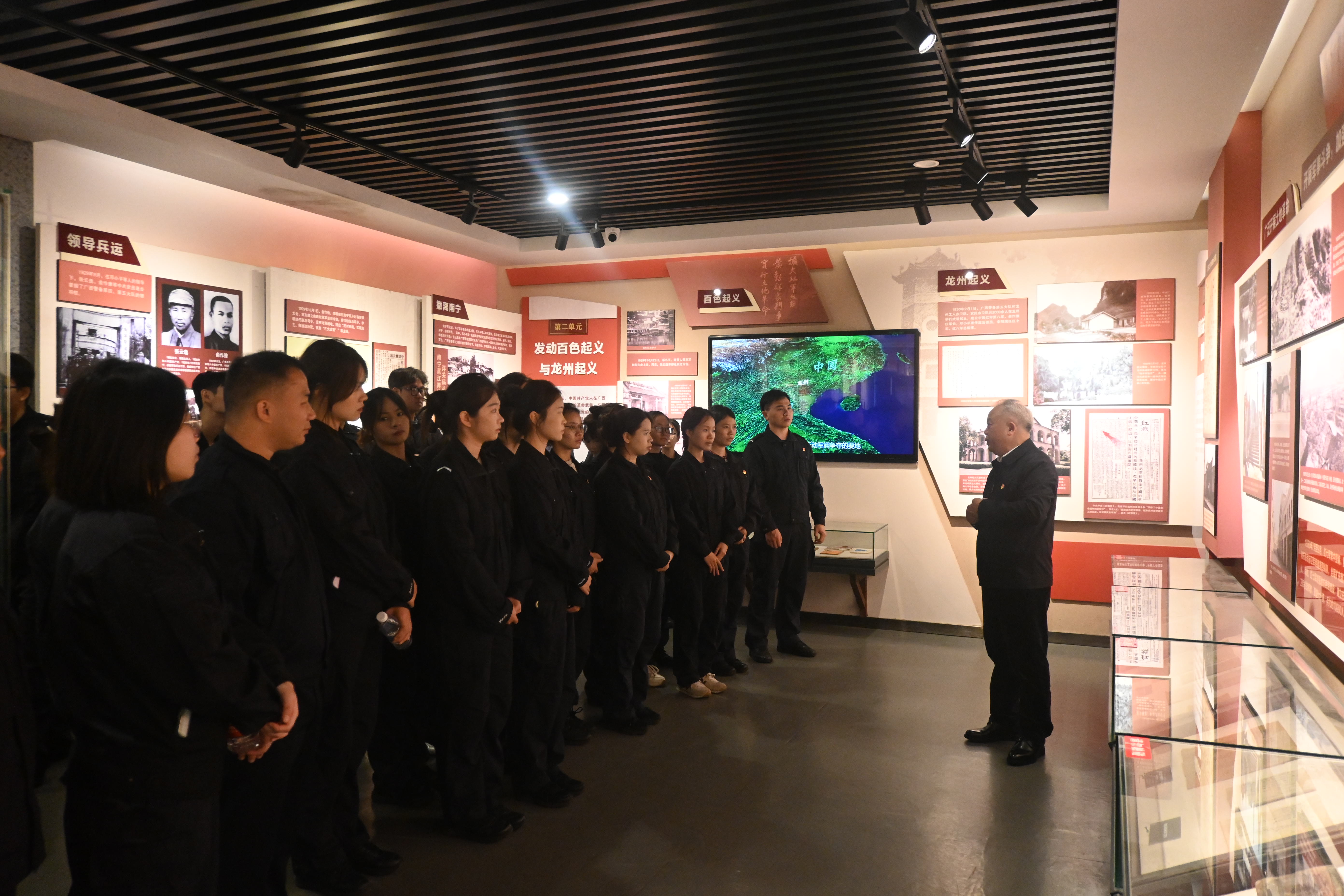 在李明瑞、韦拔群等革命烈士纪念馆,党总支书记樊宗高亲自担任“讲解员”,带领师生党员们有序参观、深情讲解。他结合自身对革命历史的深刻理解,循着展厅脉络,从烈士们投身革命的初心缘起,到烽火岁月中挺身而出的英勇壮举,再到为理想信念慷慨赴死的崇高抉择,用详实生动的语言还原了一个个感人至深的历史场景。讲解中,樊宗高书记时而驻足于珍贵的历史文物前,细数其背后承载的革命故事;时而凝视着泛黄的老照片与文献资料,深情阐释先烈们在艰难险阻中坚守的忠诚担当。师生党员们围站身旁,静静聆听、认真感悟,在书记的引领下沉浸式回溯革命先烈英勇奋斗的光辉历程,深刻体会他们无私奉献的崇高信仰与炽热的家国情怀。