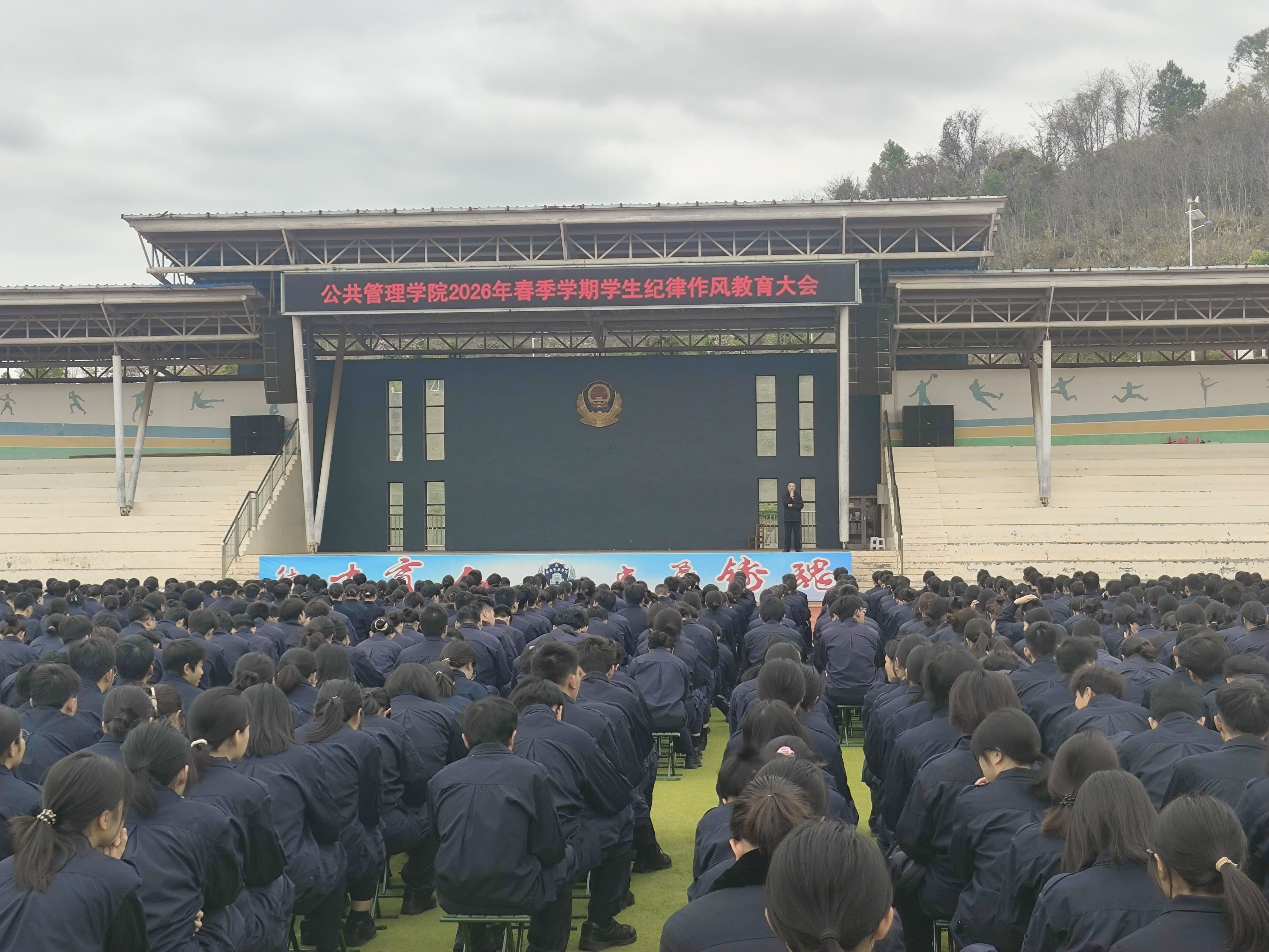 为深入贯彻公安院校警务化管理要求,强化学生纪律作风建设,引导学生迅速收心归位、以昂扬状态投入新学期学习训练,3月10日下午,公共管理学院在五合校区田径场召开2026年春季学期学生纪律作风教育大会。学院党总支副书记李海波主持会议,全体辅导员及在校学生参会。
