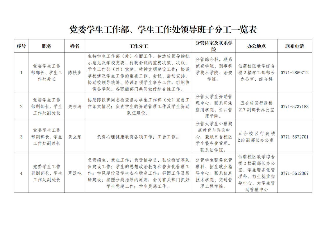 党委学生工作部、学生工作处领导班子分工一览表