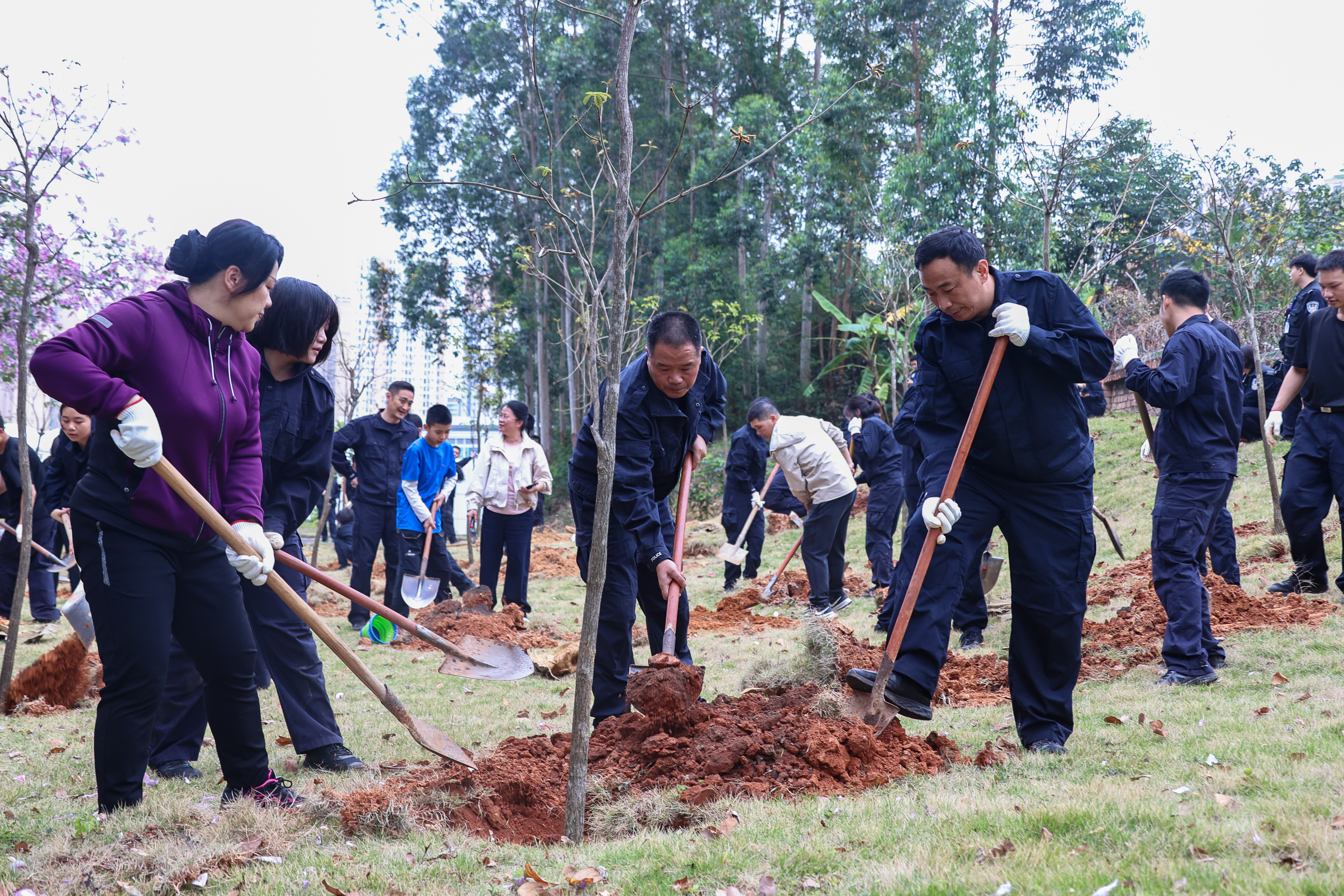 在活动现场,师生们并肩劳作,共植绿林。大家挥锹铲土、扶苗校准、培土压实、浇水灌溉,每一个环节都一丝不苟、有条不紊。老师们率先垂范,同学们干劲十足,现场秩序井然、氛围热烈,劳动的身影与初绽的新绿相映成趣,迎风挺立的苗木为春日警院注入了蓬勃生机。