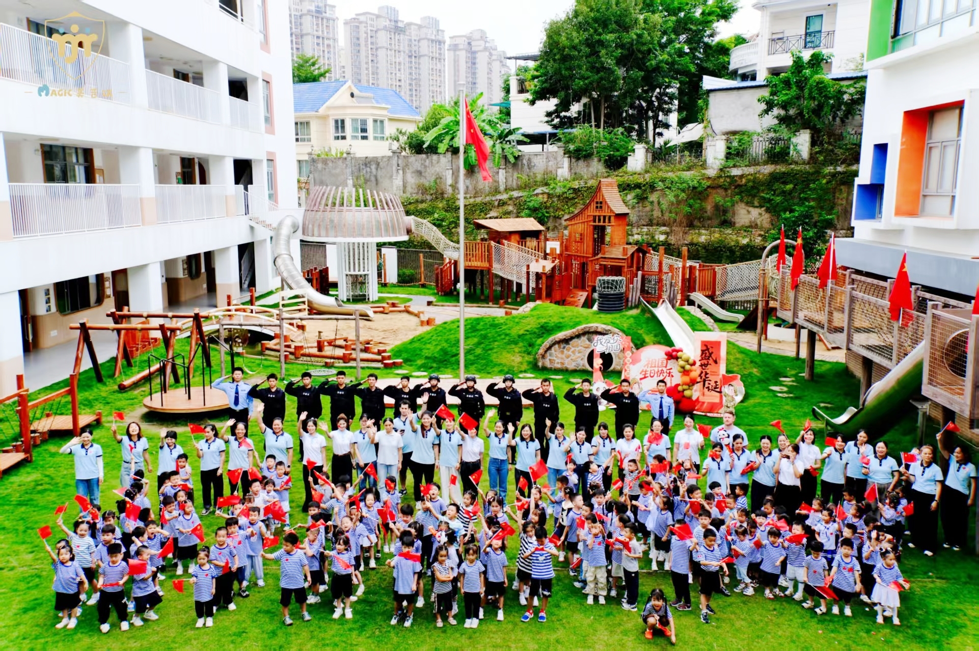 金秋送爽,丹桂飘香。9月30日,在南宁市美吉瑞幼儿园的诚挚邀请下,警务实战学院的学员们英姿飒爽地走进校园,为全体师生带来了一场庄严神圣的升旗仪式和一场精彩绝伦的警务技能战术表演。