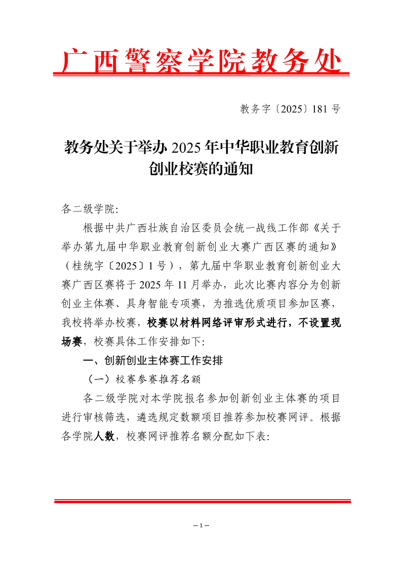 教务处关于举办2025年中华职业教育创新创业校赛的通知 来源: 发布时间:2025-10-17 18:40:14 浏览次数: 次 【字体:小 大】 附件1.关于举办第九届中华职业教育创新创业大赛广西区赛的通知.pdf附件2.第九届中华职业教育创新创业大赛广西区赛评审规则.docx附件3.项目评审书.docx附件4.2025年中华职业教育创新创业大赛TapTap点点校赛推荐项目汇总表.xlsx附件5.第九届中华职业教育创新创业大赛广西赛区具身智能赛参赛材料.docx 分享到: 【打印正文】