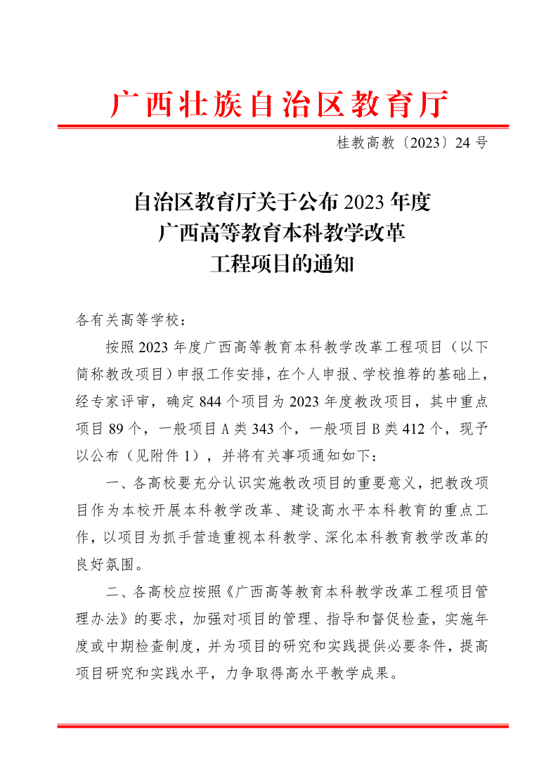 桂教高教〔2023〕24号自治区教育厅关于公布2023年度广西高等教育本科教学改革工程项目的通知 来源: 发布时间:2023-06-28 11:39:29 浏览次数: 次 【字体:小 大】 分享到: 【打印正文】