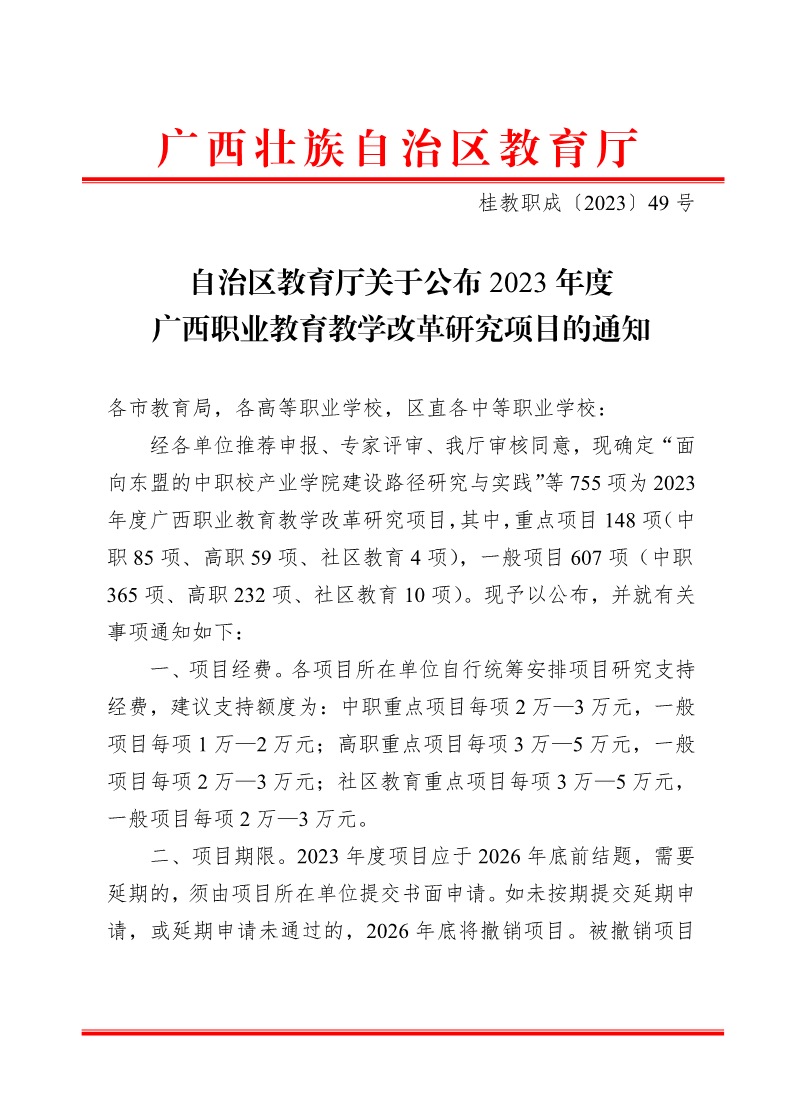 桂教职成〔2023〕49号自治区教育厅关于公布2023年度广西职业教育教学改革研究项目的通知 来源: 发布时间:2023-08-28 11:49:43 浏览次数: 次 【字体:小 大】 分享到: 【打印正文】