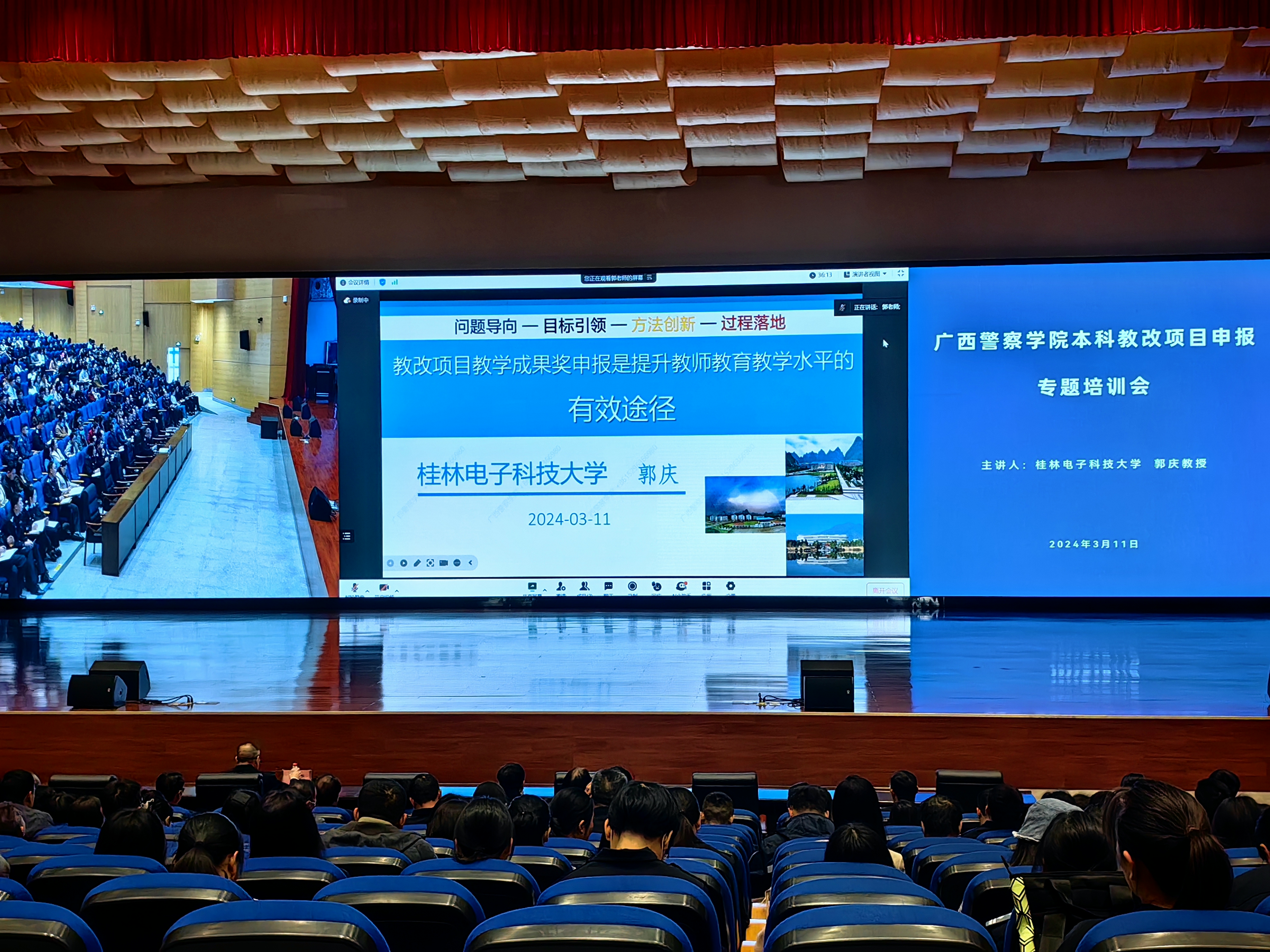 会上,郭庆教授以“教改项目教学成果奖申报是提升教师教育教学水平的有效途径”为题,从教学成果获奖名单谈起、广西教改项目申报书比较、教改项目与科研项目区别、问题导向与方法创新先行、目标引领与过程落地并举、教改项目申请书撰写说明、教学成果奖申报前期工作七个方面针对如何撰写教改项目作了详细阐述与分析,并以案例为引导,对项目申请书的题目、填写规范、成果形式等进行了针对性指导。