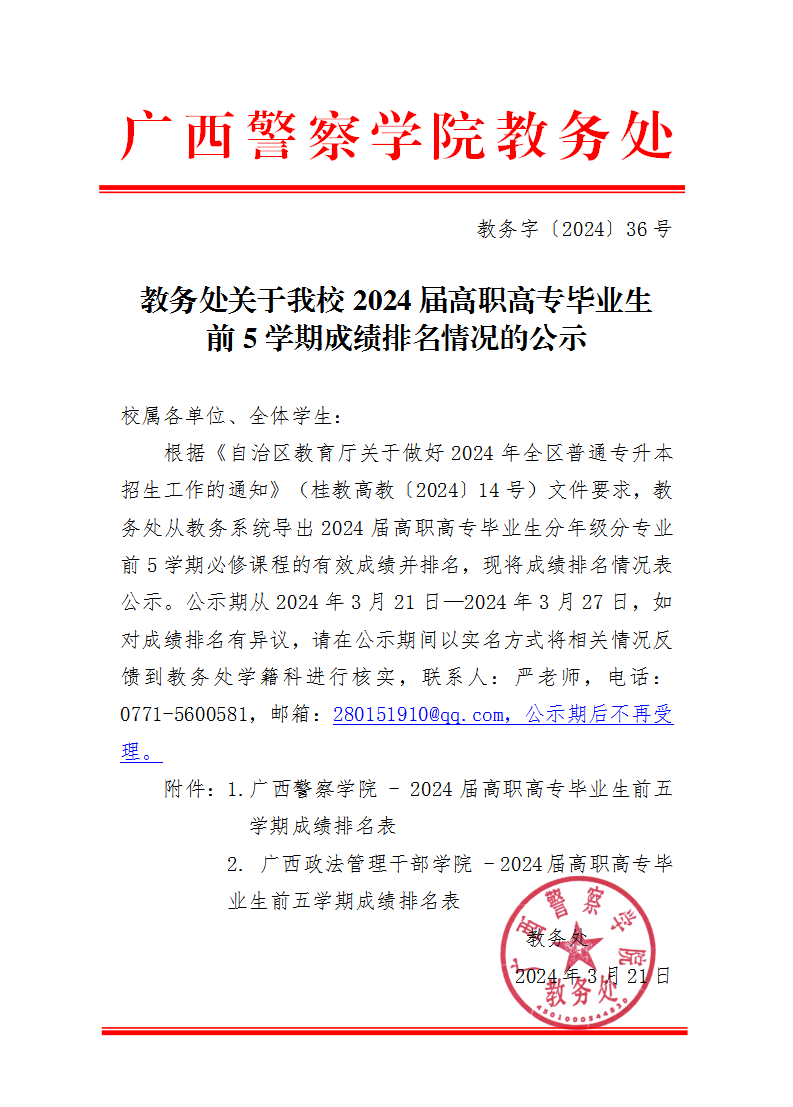 教务处关于TapTap2024届高职高专毕业生前5学期成绩排名情况的公示 来源: 发布时间:2024-03-21 15:10:56 浏览次数: 次 【字体:小 大】 附件1:TapTap点点 - 2024届高职高专毕业生前五学期成绩排名表.rar附件2:广西政法管理干部学院 - 2024届高职高专毕业生前五学期成绩排名表.rar 分享到: 【打印正文】