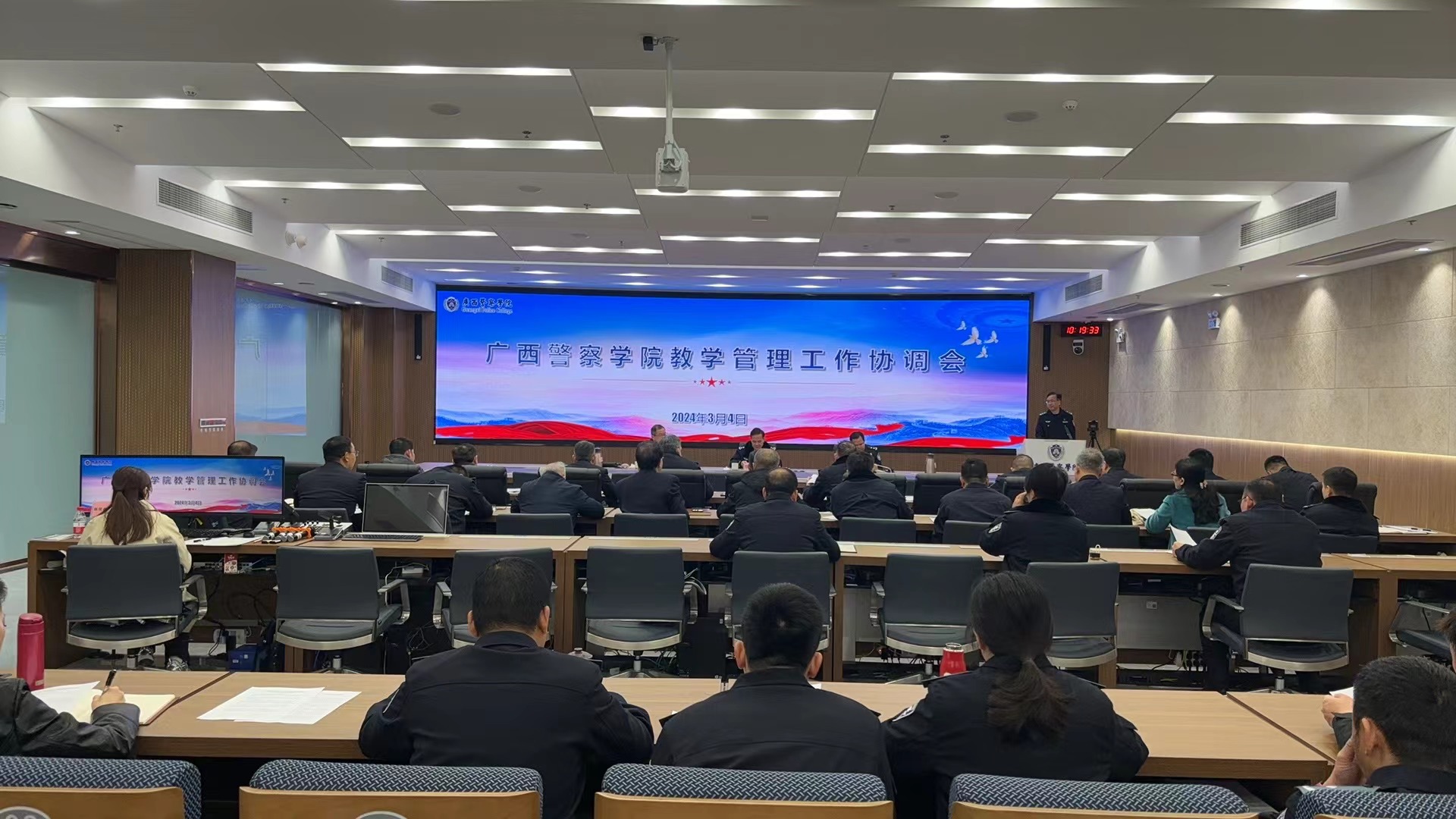 2024年3月4日上午,学校在仙葫校区智慧公安研训基地召开2024年春季学期教学管理工作协调会。会议由覃干超同志主持,校领导陈恃中同志、谢鹏同志出席会议。
