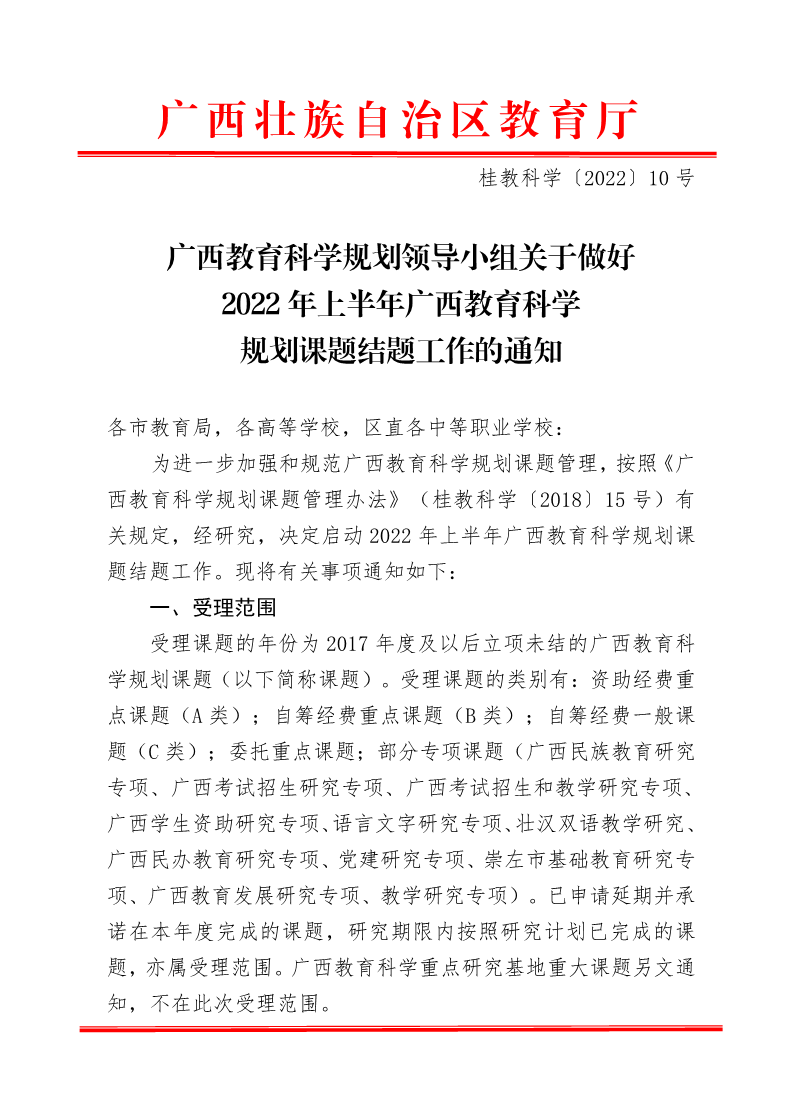 广西教育科学规划领导小组关于做好2022年上半年广西教育科学规划课题结题工作的通知 来源: 发布时间:2022-03-23 12:17:09 浏览次数: 次 【字体:小 大】 智能标签: 教育科学 关于做好 广西教育科学规划课题 结题工作 分享到: 【打印正文】 相关内容