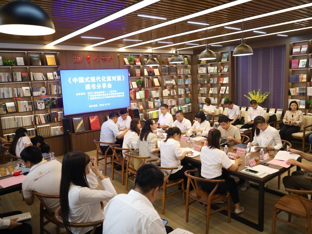 10月18日,马克思主义学院直属党支部与当代广西杂志社第一和第二党支部、广西新华传文大中专教材有限公司党支部在当代广西杂志社当代书院联合开展《中国式现代化面对面》读书分享会暨主题党日活动。