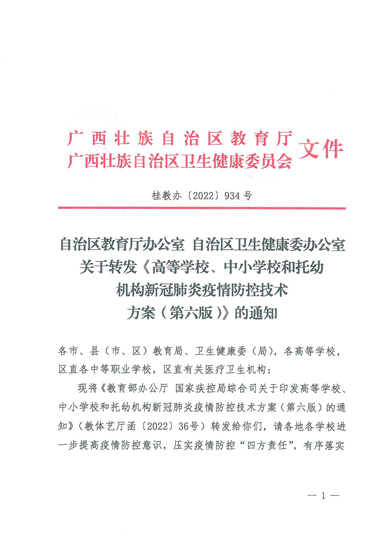 桂教办〔2022〕934号自治区教育厅办公室自治区卫生健康委办公室关于转发《高等学校、中小学校和托幼机构新冠肺炎疫情防控技术方案(第六版)的通知》 来源: 发布时间:2022-10-08 09:31:09 浏览次数: 次 【字体:小 大】 分享到: 【打印正文】