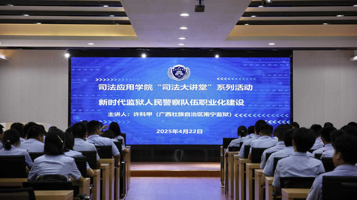 为深化学生对监狱行业发展的认知,提升专业素养与职业精神,4月22日下午,司法应用学院在五合校区2号实训楼301教室举办“司法大讲堂”系列活动。南宁监狱党委委员、副监狱长许科甲应邀作主题为“新时代监狱人民警察队伍职业化建设”的专题讲座。讲座由我院副院长廖炜主持,2023级、2024级本科监狱学专业120名学生参加了学习。