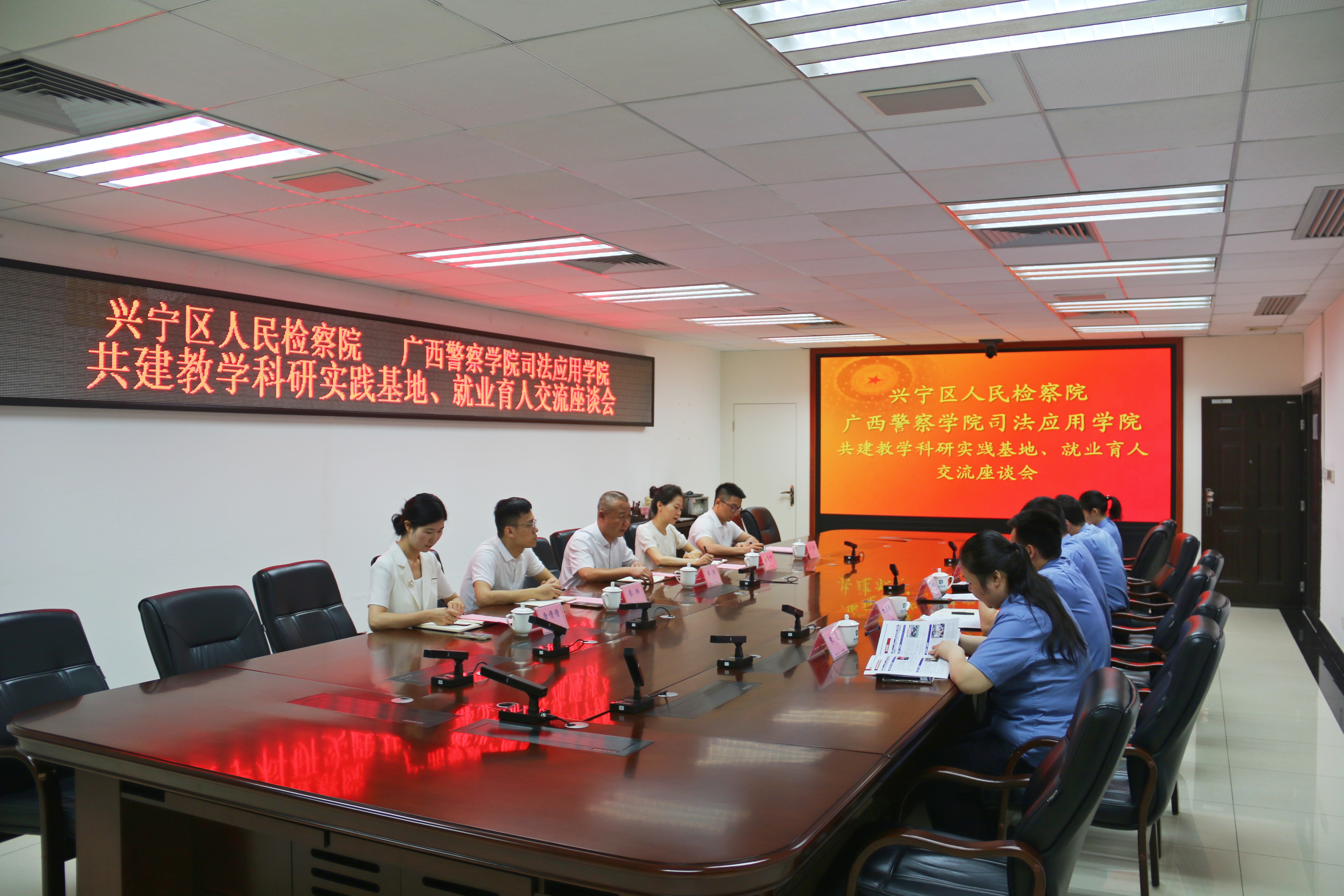 黎民诚检察长对我院王洪书记一行的到来表示热烈的欢迎,提出了双方合作的几点思路。甘鸿翔副检察长详细介绍了兴宁区人民检察院基本概况、实习生接收情况等,并表示期待接下来双方进一步的交流合作。