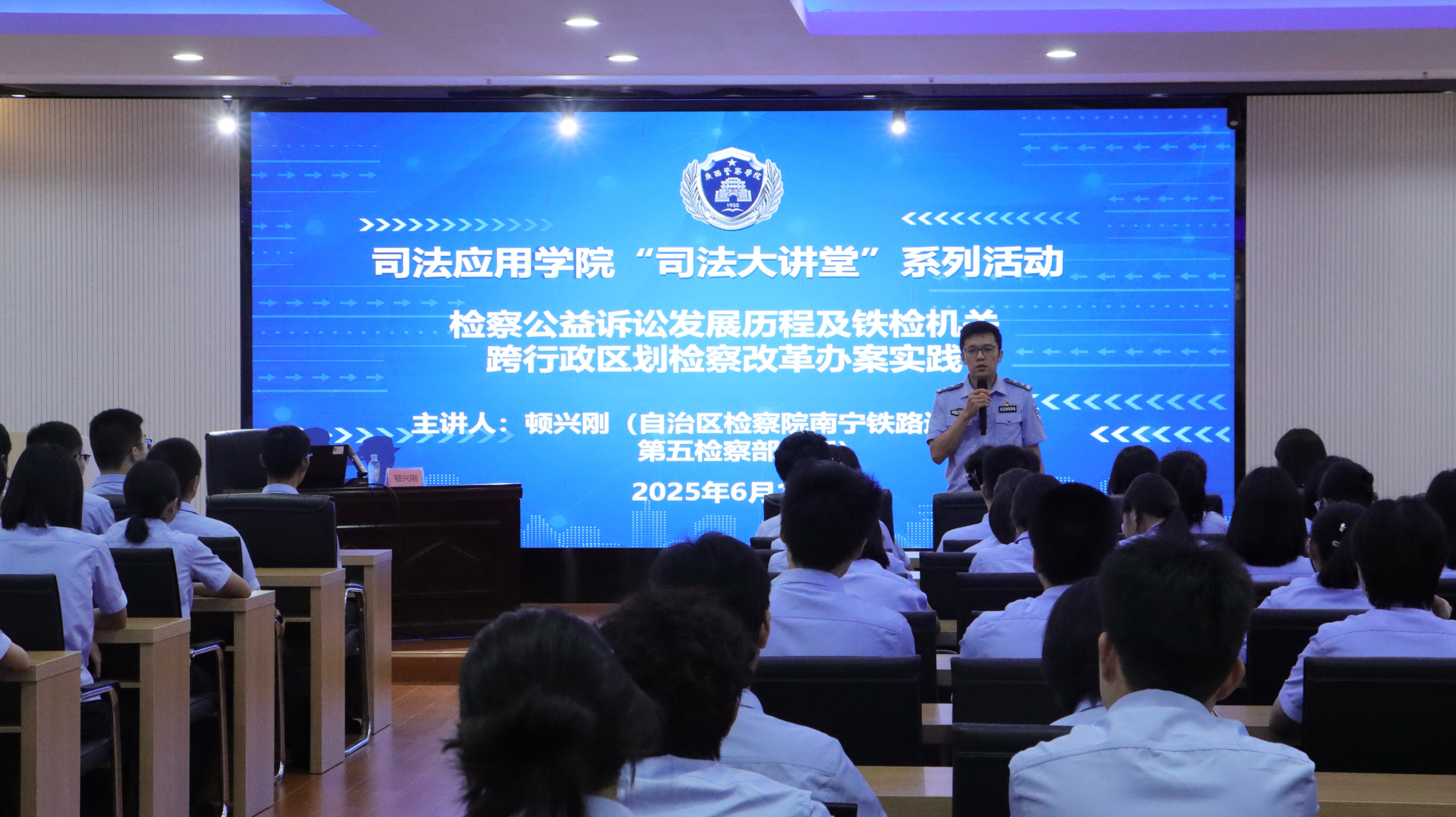 为拓宽师生司法视野,深化对检察公益诉讼及跨行政区划检察改革的认识,6月17日下午,司法应用学院在五合校区二号实训楼301会议室举办“司法大讲堂”第十二讲。本次讲座主题为“检察公益诉讼发展历程及铁检机关跨行政区划检察改革办案实践”,特邀自治区检察院南宁铁路运输分院第五检察部(公益诉讼部)主任顿兴刚主讲。讲座由司法应用学院副院长廖炜主持,司法应用学院、法学院、公共管理学院约150名学生参与。