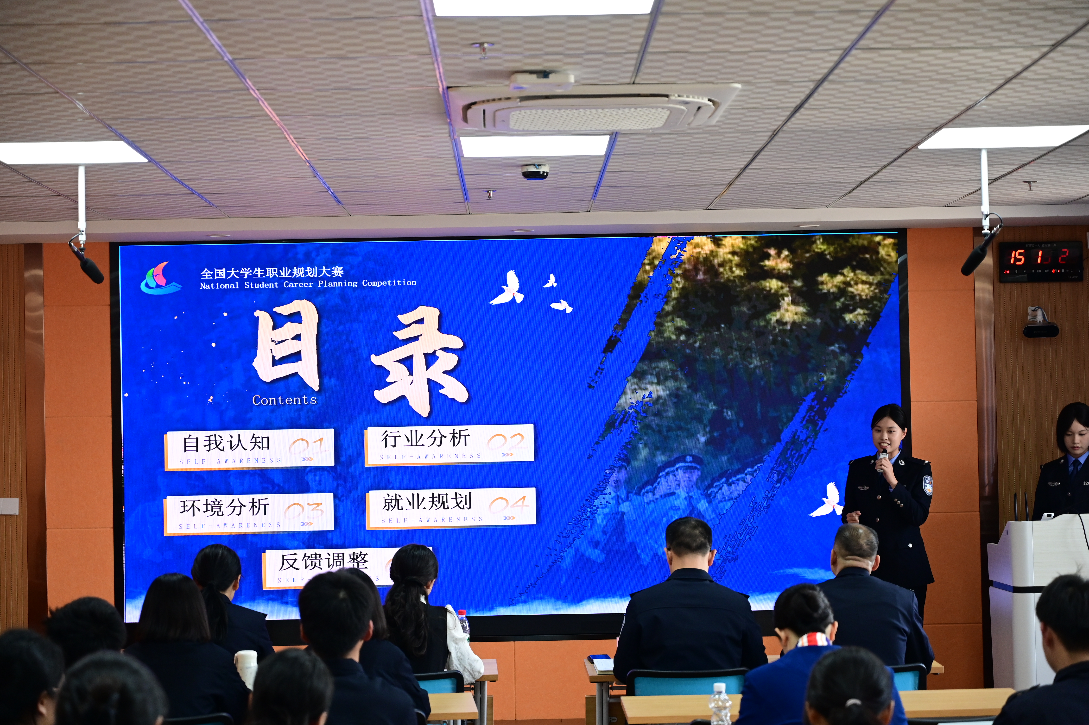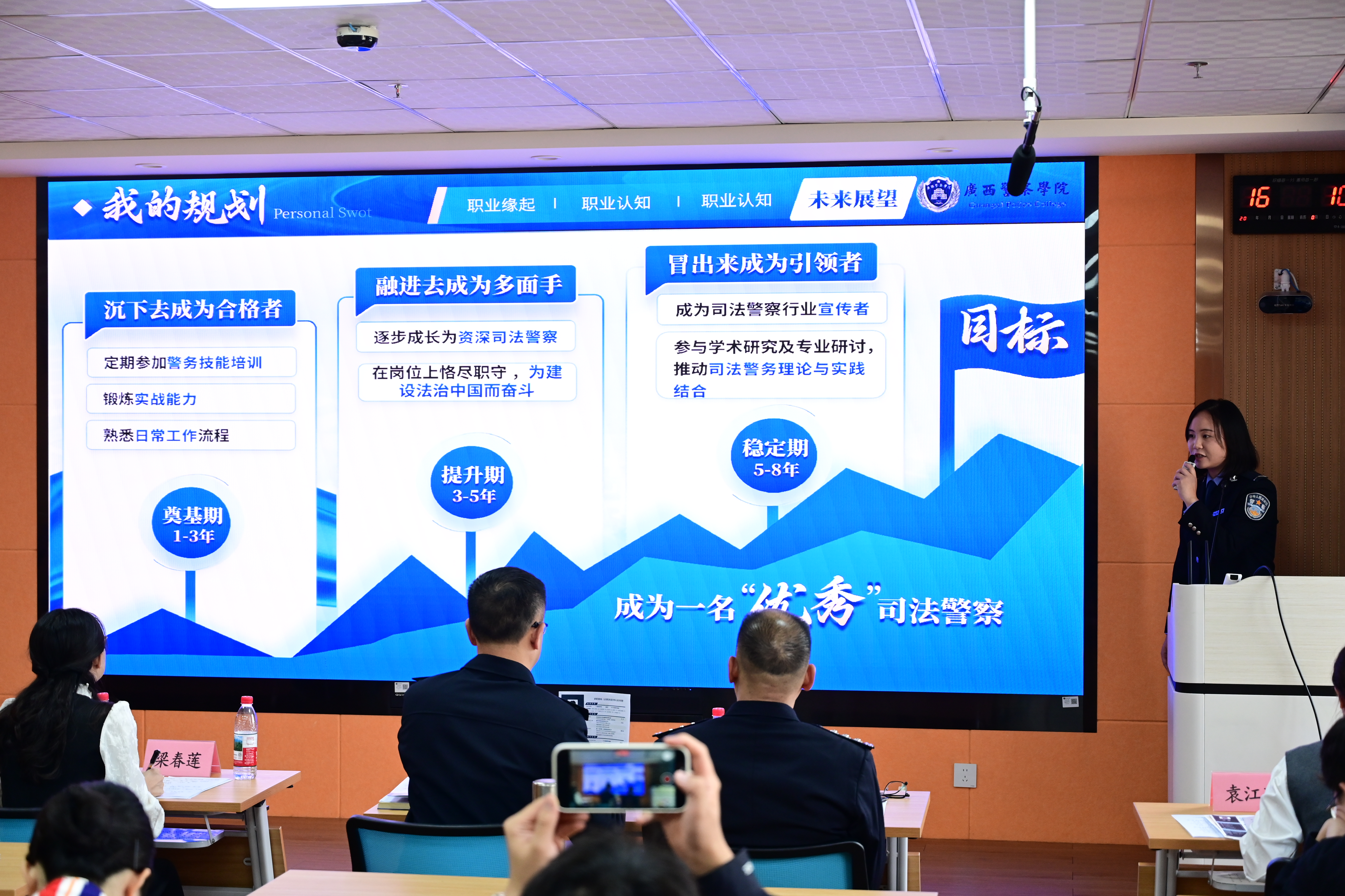 决赛现场,选手们通过PPT展示、现场答辩等形式,围绕职业认知、自我探索、规划路径与实践策略进行生动阐述。我院四位同学立足司法警务领域,结合专业特色与实战需求,呈现了目标明确、路径清晰、贴合实际的职业生涯规划。面对评委提问,她们沉着应对、对答如流,精准阐释规划关键与难点,充分展现了司法应用专业学子扎实的专业基础、敏捷的逻辑思维和良好的表达能力。