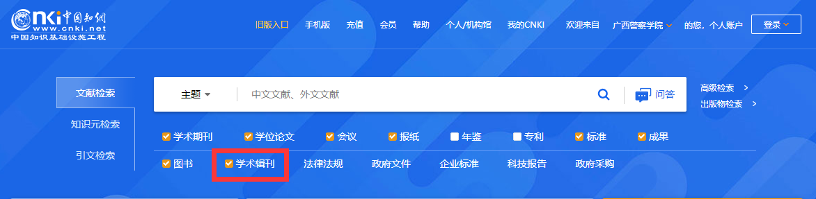 在知网首页检索框下方,勾选“学术辑刊”后,在一框式中与其他文献一并进行统一检索得到结果;