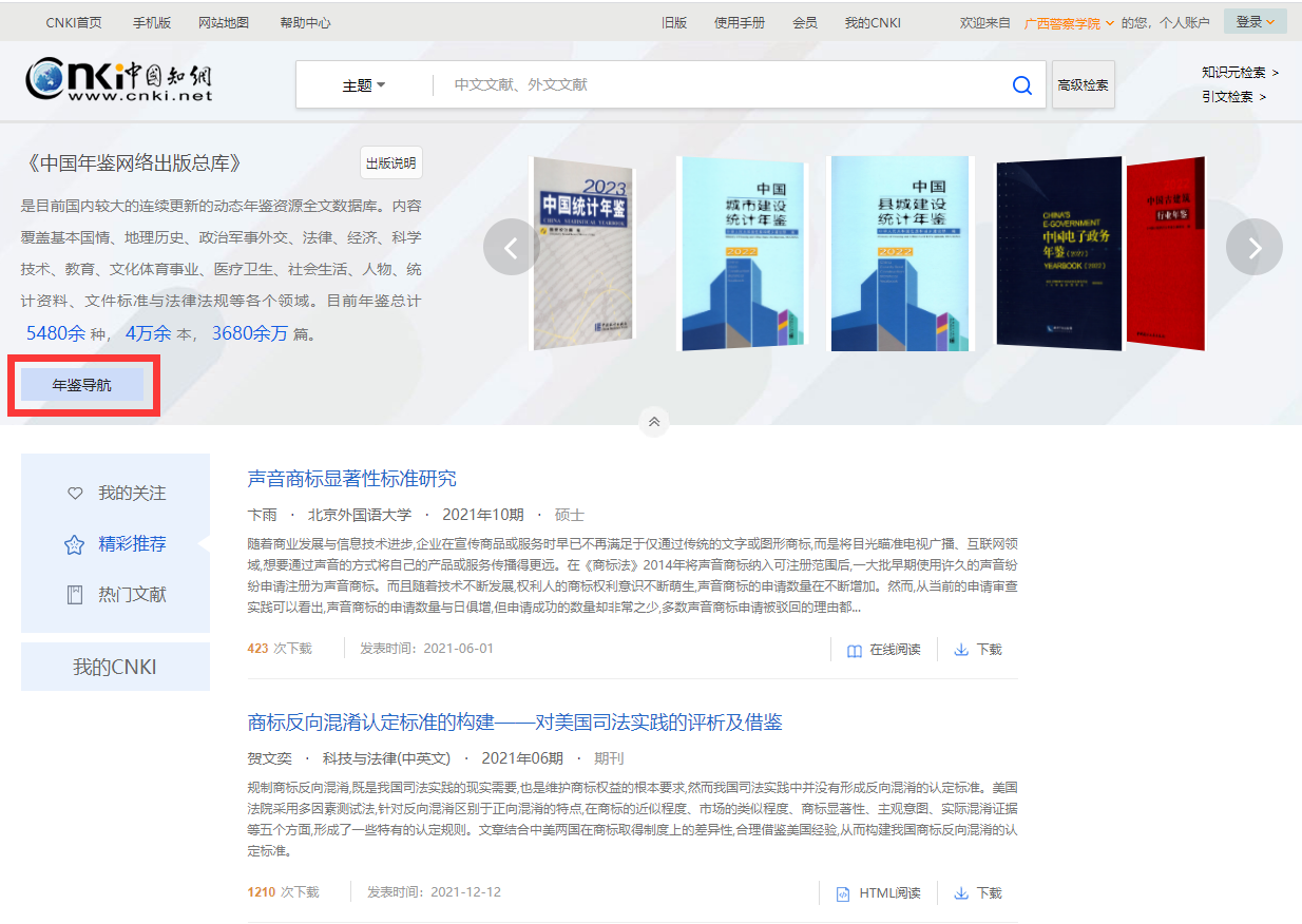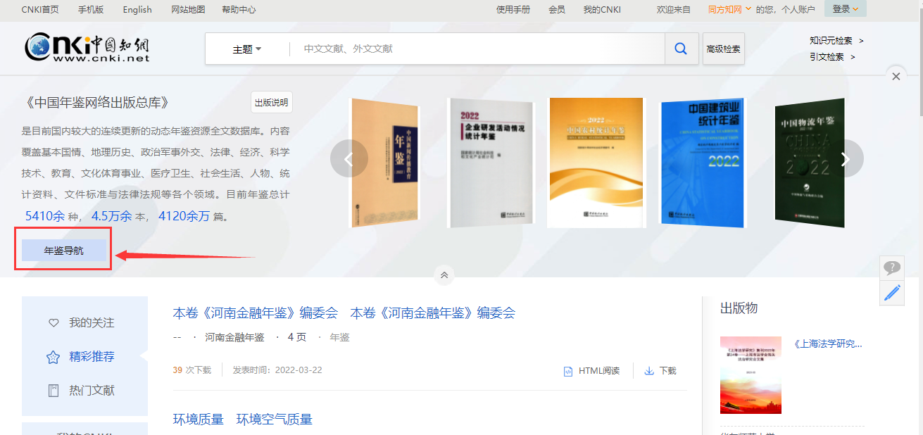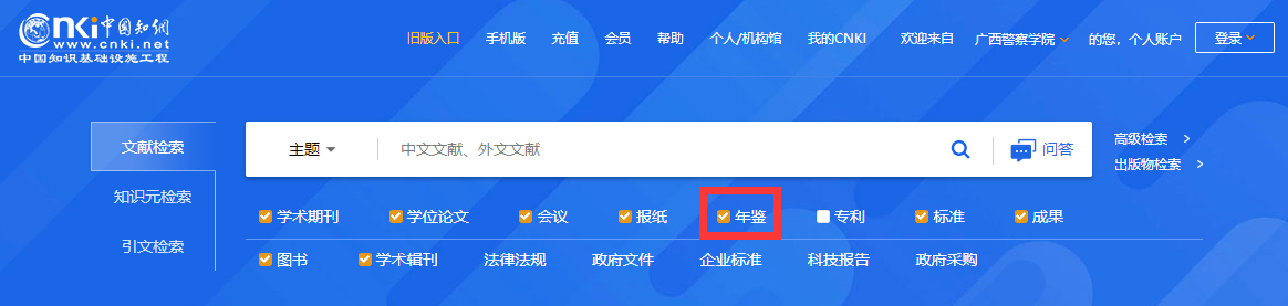 在知网首页,默认情况下“年鉴”是未勾选的。勾选“年鉴”后,在一框式中与其他文献一并进行统一检索得到结果;也可以点击“年鉴”,进入到年鉴首页。