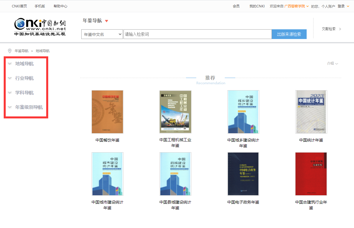 进入年鉴首页后与其他产品使用方式相同,点击左边的年鉴导航可以进一步查找目标年鉴详细信息,提供包括地域导航、行业导航、学科导航、年鉴级别导航共4种导航方式。
