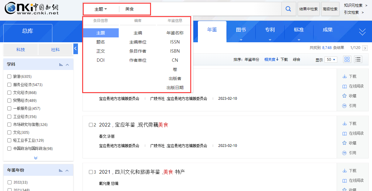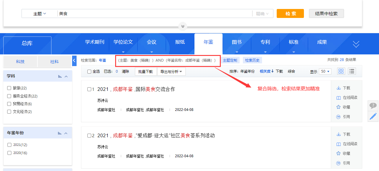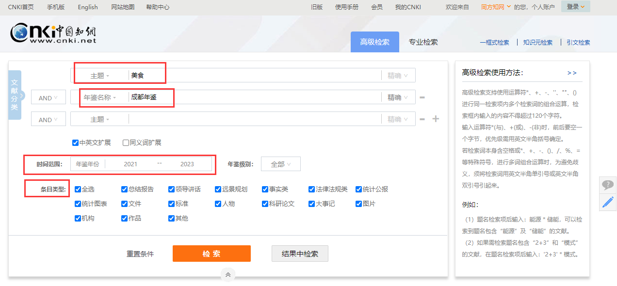 以“主题:美食;年鉴名称:成都年鉴;时间范围:2021-2023”为例,演示高级检索。
