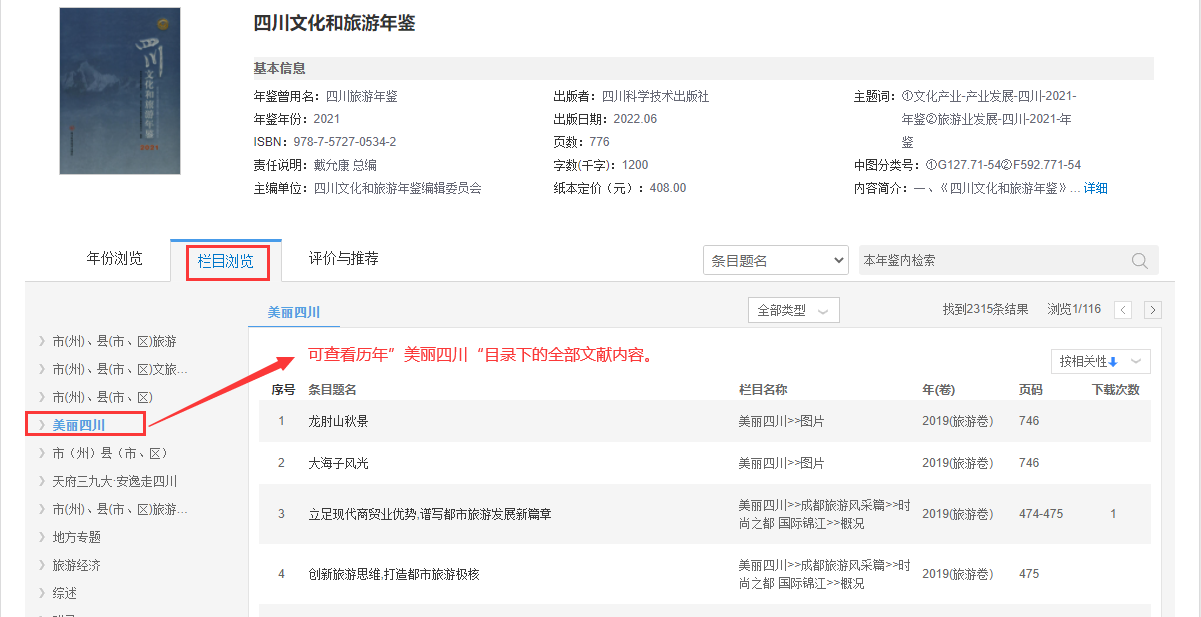 在年鉴首页左边点击进入年鉴导航,可按年鉴名、地域、关键词、主编、出版者等条件进行检索,进入具体年鉴页面后可整刊浏览;也可按年份、栏目进行浏览;还可以在该本年鉴内再次检索具体内容。