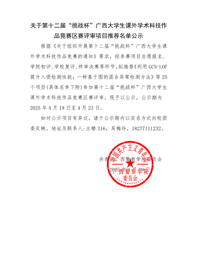 关于第十二届“挑战杯”广西大学生课外学术科技作 品竞赛区赛评审项目推荐名单公示 来源: 发布时间:2025-04-19 19:43:30 浏览次数: 次 【字体:小 大】 具体名单见链接:202504191945350520.pdf 分享到: 【打印正文】
