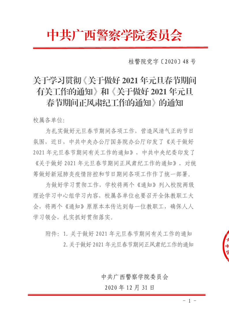 关于学习贯彻《关于做好 2021 年元旦春节期间 有关工作的通知》和《关于做好 2021 年元旦 春节期间正风肃纪工作的通知》的通知 来源: 发布时间:2020-12-31 11:50:20 浏览次数: 次 【字体:小 大】 202101051149339640.docx202101051149337731.docx 分享到: 【打印正文】