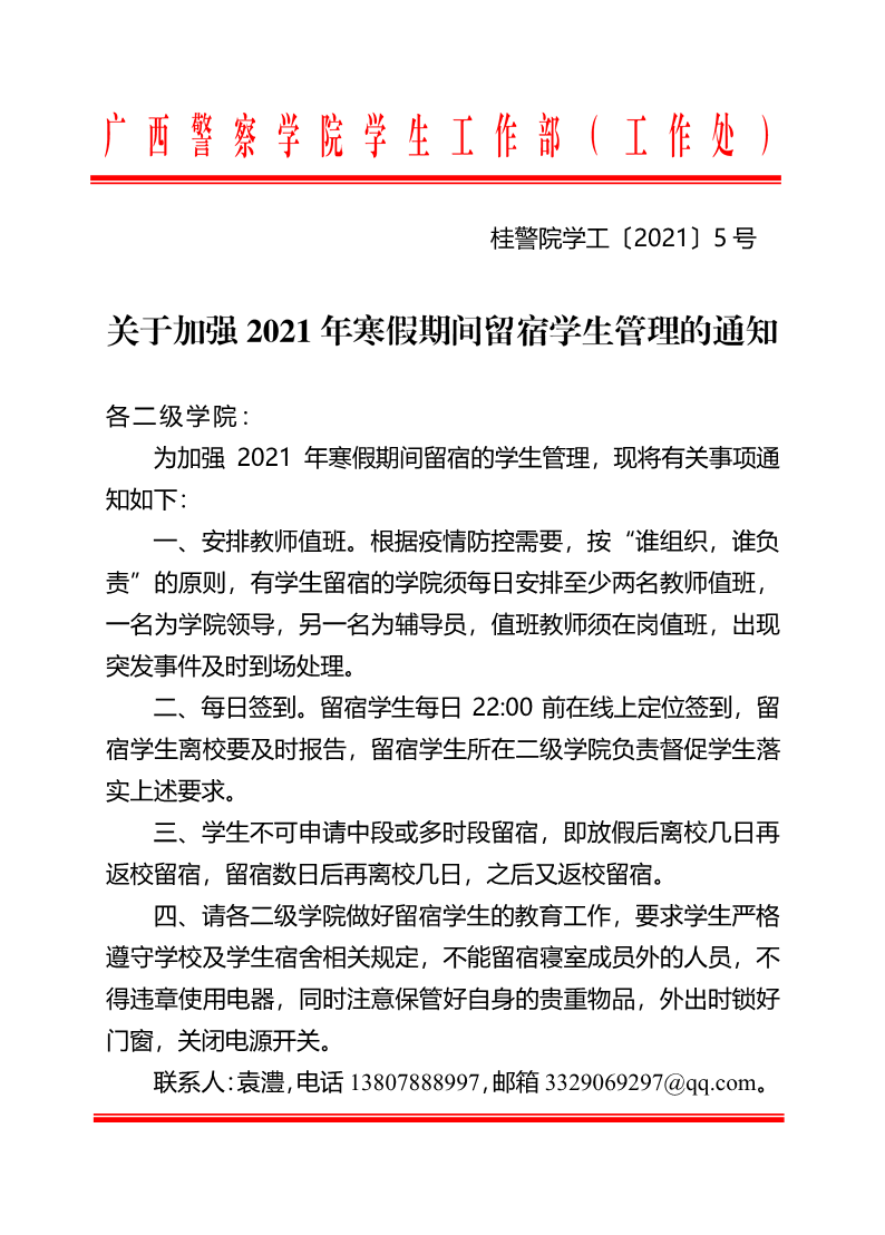 关于加强2021年寒假期间留宿学生管理的通知