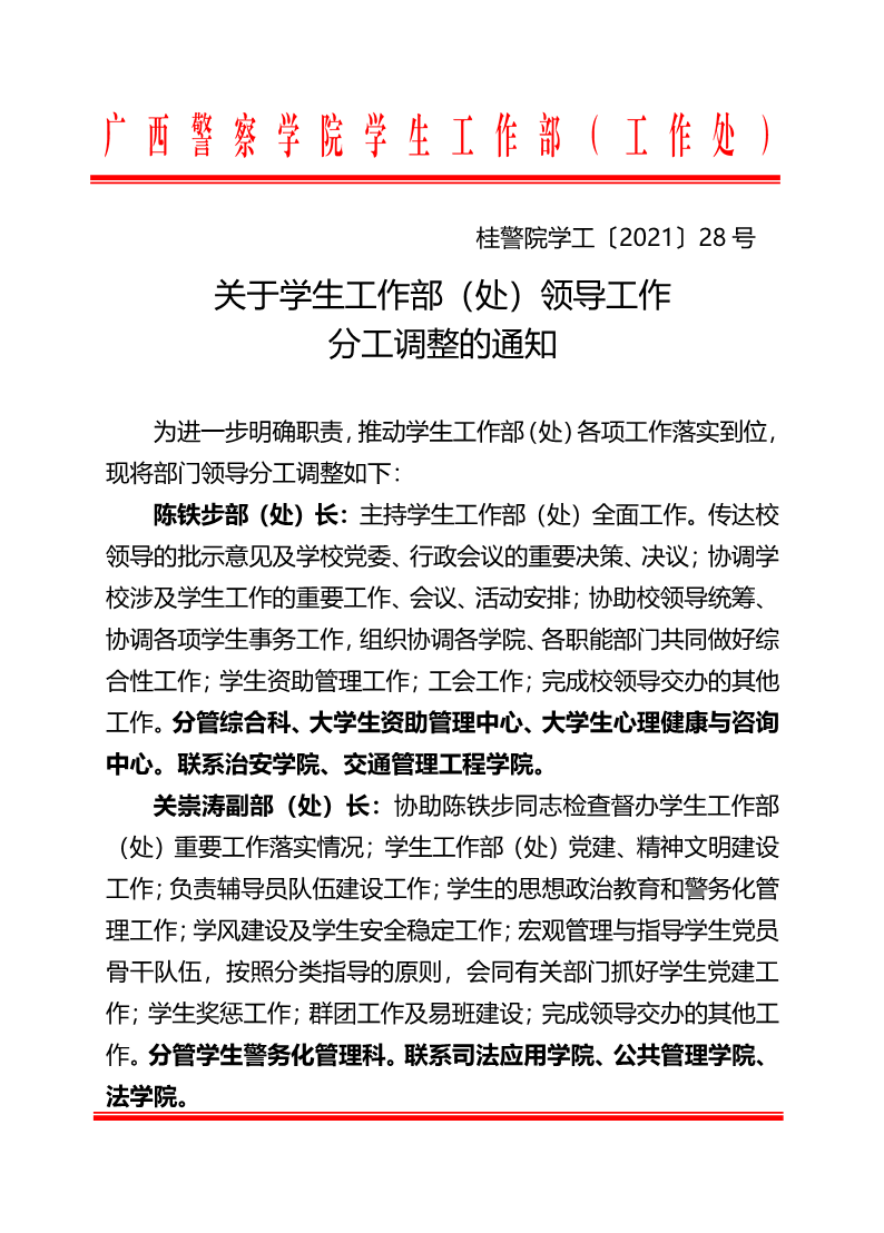 关于学生工作部(处)领导工作分工调整的通知