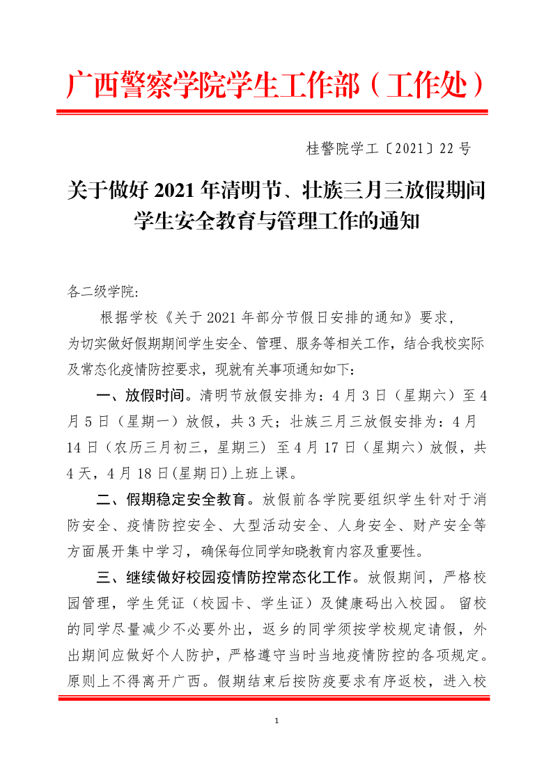 关于做好2021年清明节、壮族三月三放假期间学生管理工作的通知