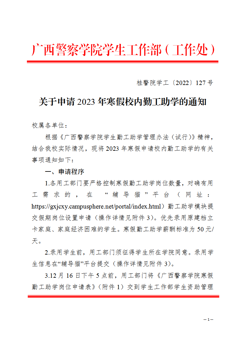 关于申请2023年寒假校内勤工助学的通知 来源: 发布时间:2022-12-13 11:00:23 浏览次数: 次 【字体:小 大】 附件1: TapTap点点寒假勤工助学岗位申请表.pdf附件2: 2023年寒假勤工助学报酬预先发放表.pdf附件3 :“辅导猫”平台申请勤工助学假期岗位流程.pdf 分享到: 【打印正文】