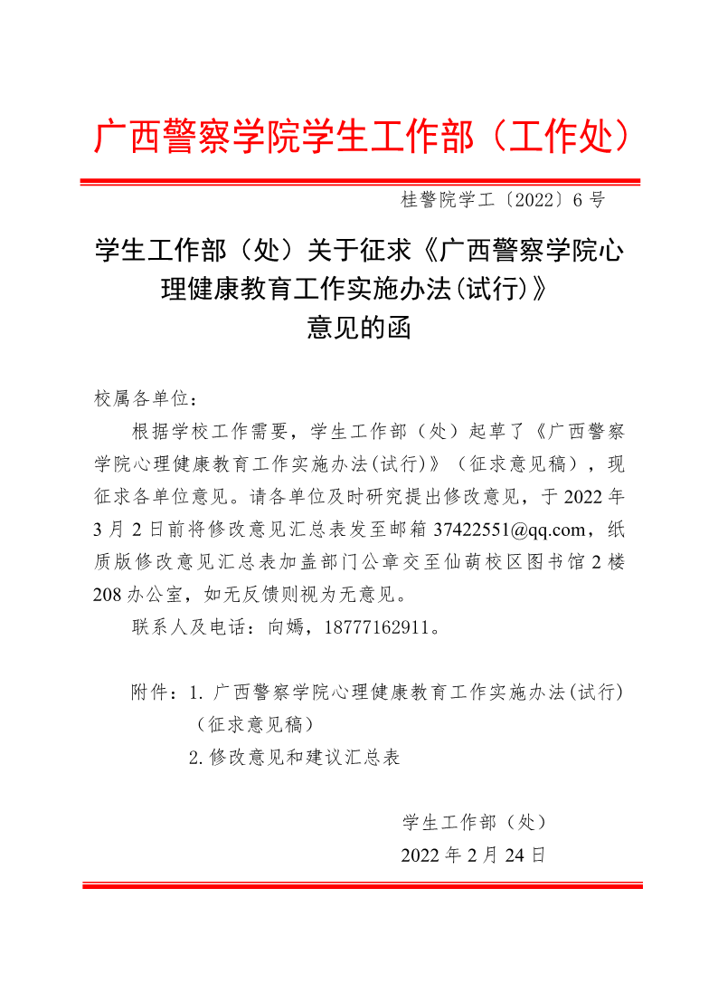 学生工作部(处)关于征求《TapTap点点心理健康教育工作实施办法(试行)》意见的函 来源: 发布时间:2022-02-24 15:00:35 浏览次数: 次 【字体:小 大】 附件1:TapTap点点心理健康教育工作实施办法(试行)(征求意见稿).pdf附件2:修改意见和建议汇总表.pdf 分享到: 【打印正文】
