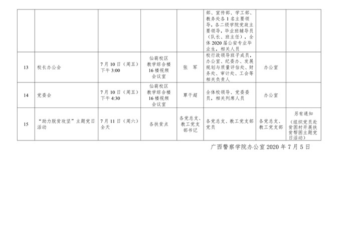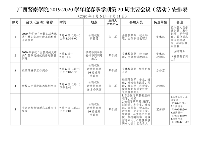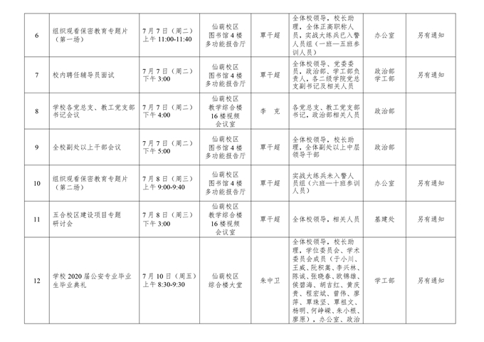 学校第20周主要会议(活动)安排(2020.7.6.-7.10.)