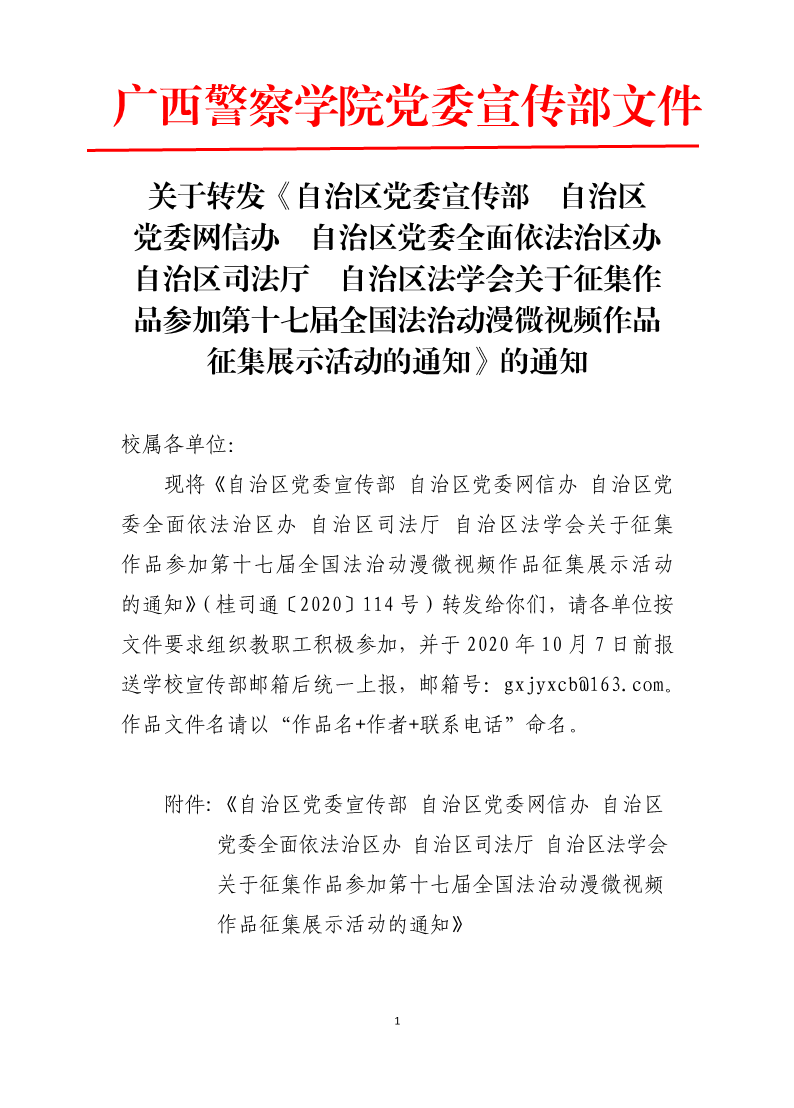 关于转发《自治区党委宣传部 自治区党委网信办 自治区党委全面依法治区办 自治区司法厅 自治区法学会关于征集作品参加第十七届全国法治动漫微视频作品征集展示活动的通知》的通知 来源: 发布时间:2020-09-23 15:52:33 浏览次数: 次 【字体:小 大】 202009231607097859.PDF 分享到: 【打印正文】