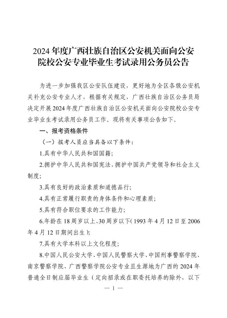 2024年度广西壮族自治区公安机关面向公安院校公安专业毕业生考试录用公务员公告 来源: 发布时间:2024-04-12 18:34:41 浏览次数: 次 【字体:小 大】 附件:2024年度广西壮族自治区公安机关面向公安院校公安专业毕业生考试录用公务员职位计划表 分享到: 【打印正文】