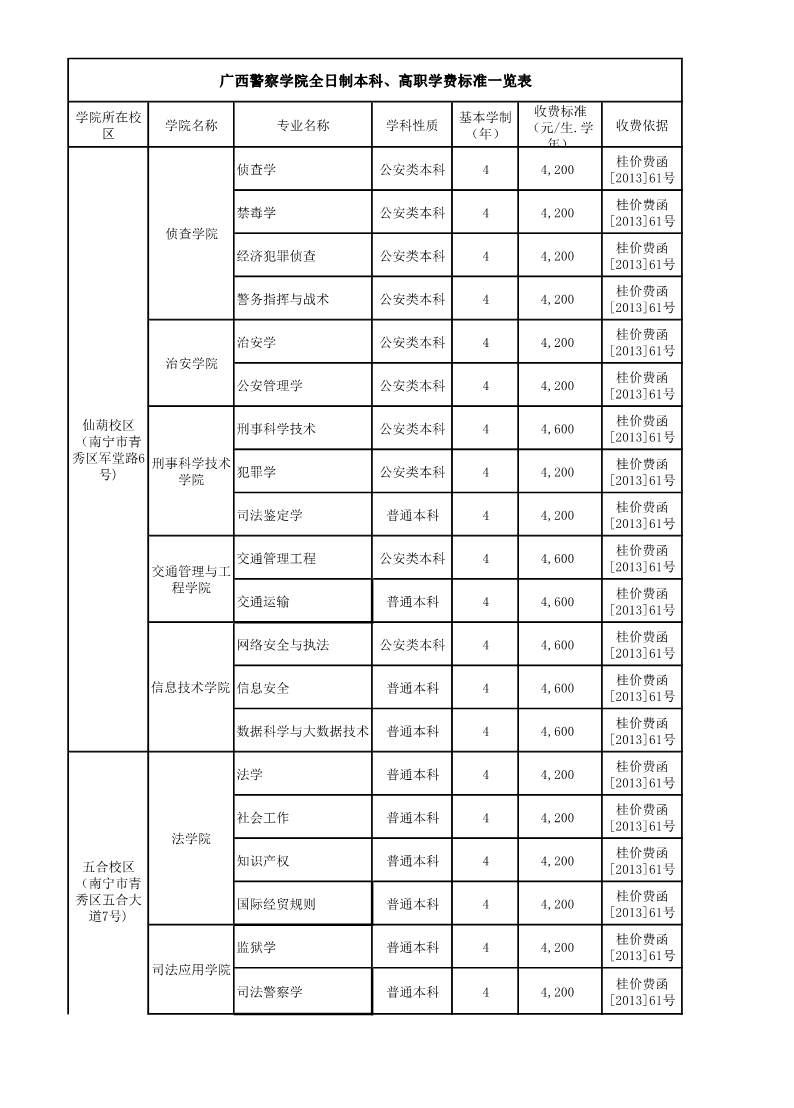 2024-2025学年全日制普通本科、高职收费标准一览表