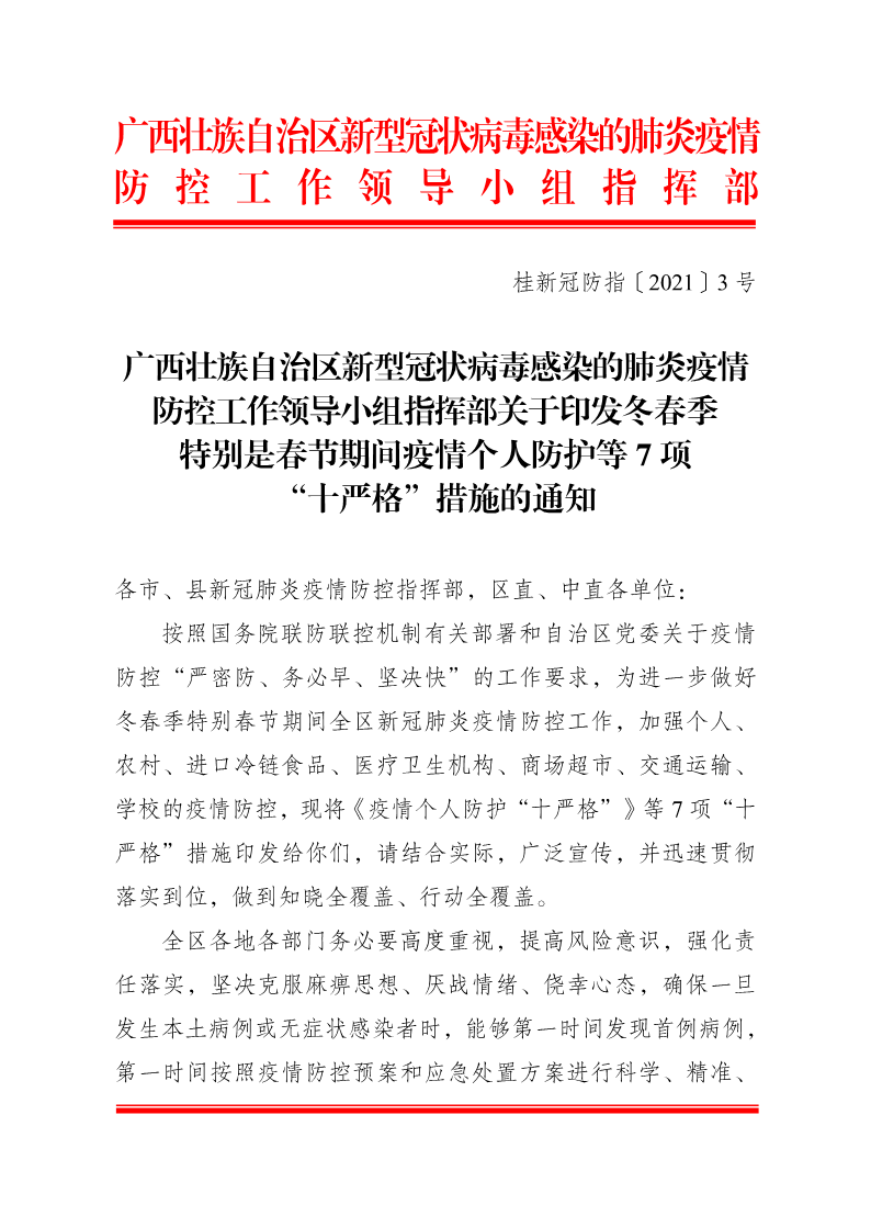 桂新冠防指〔2021〕3号关于印发冬春季特别是春节期间疫情个人防护等7项“十严格”措施的通知 来源: 发布时间:2021-01-14 16:11:35 浏览次数: 次 【字体:小 大】 分享到: 【打印正文】