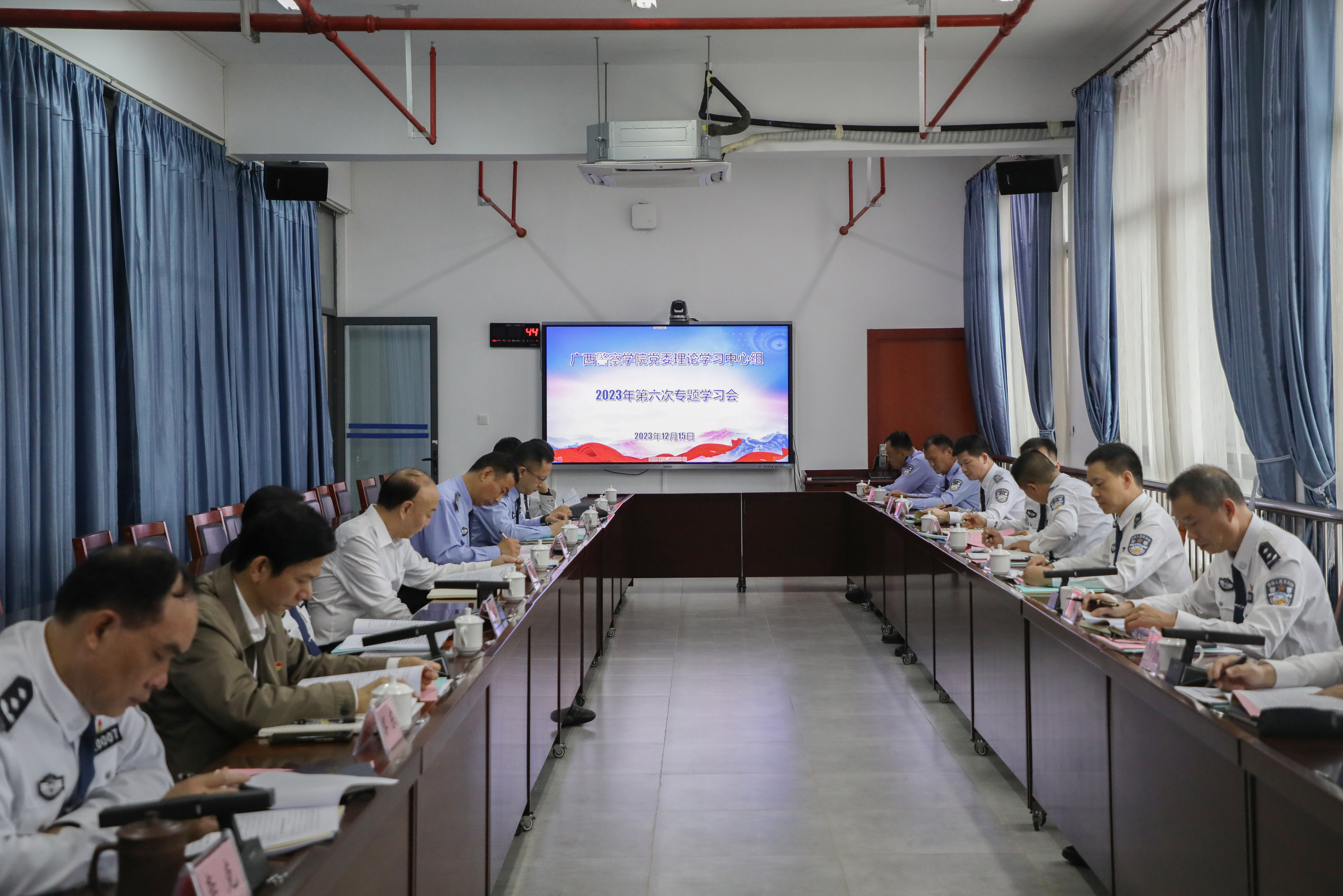 覃干超作总结讲话,他指出,一要提高政治站位,认真学习、全面准确领会习近平总书记系列重要讲话精神,坚持不懈用习近平新时代中国特色社会主义思想凝心铸魂,确保学校各级党组织和党员干部自觉同以习近平同志为核心的党中央保持高度一致。二要强化责任担当,毫不松劲推动习近平总书记系列重要讲话精神在学校落地生根、开花结果,加强校园文化建设,以良好校园文化浸润教风学风;教育引导师生铸牢中华民族共同体意识;不断推动清廉警院建设走深走实;落实习近平总书记关于中国式现代化的一系列重要论述,总结好评建工作经验,办好人民满意的公安高等教育。三要坚持学以致用,持续推动党委理论学习中心组学习提质增效,不断提高运用党的创新理论解决实际问题的能力,加快推动学校高质量发展,为奋力谱写中国式现代化广西篇章贡献警院力量。