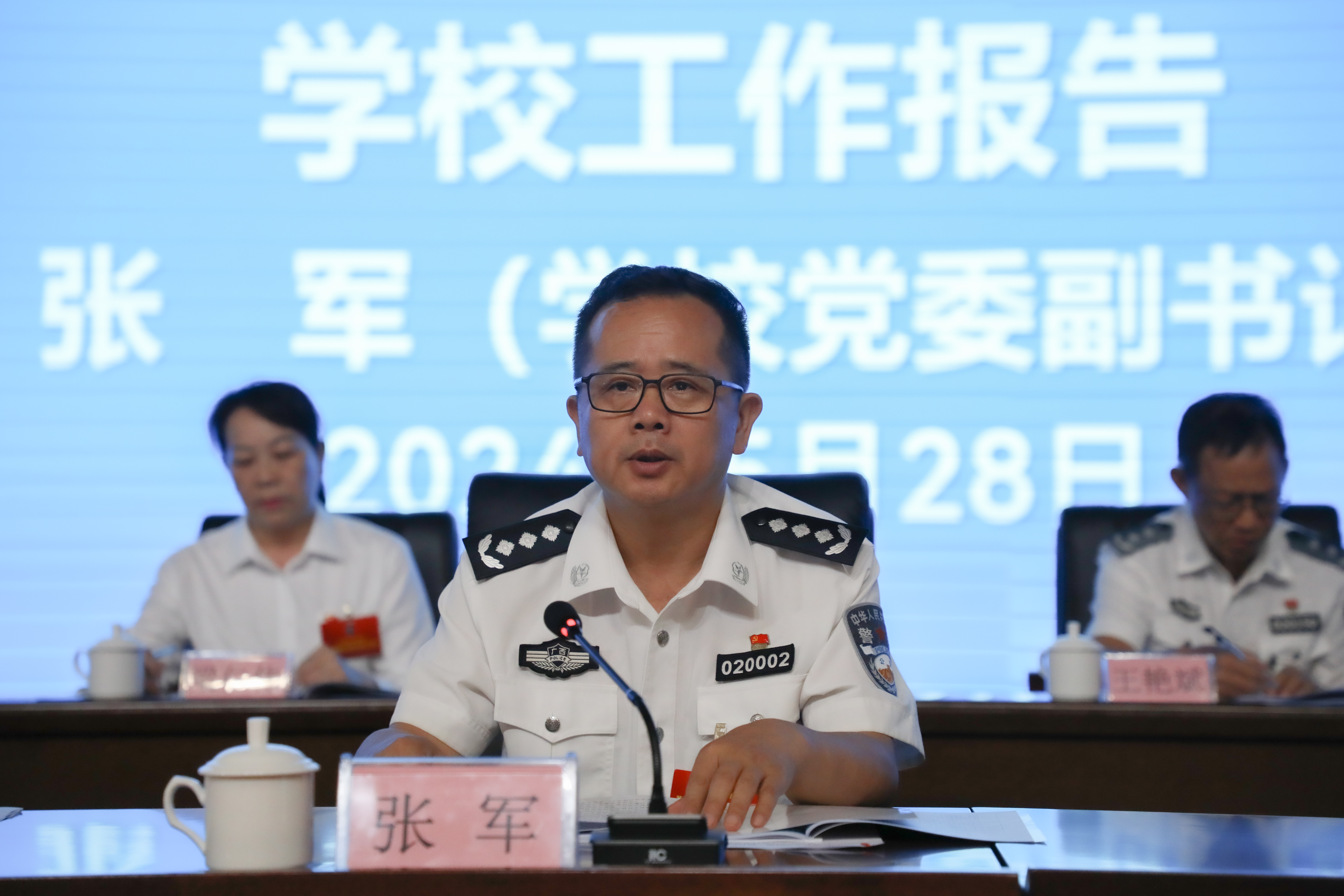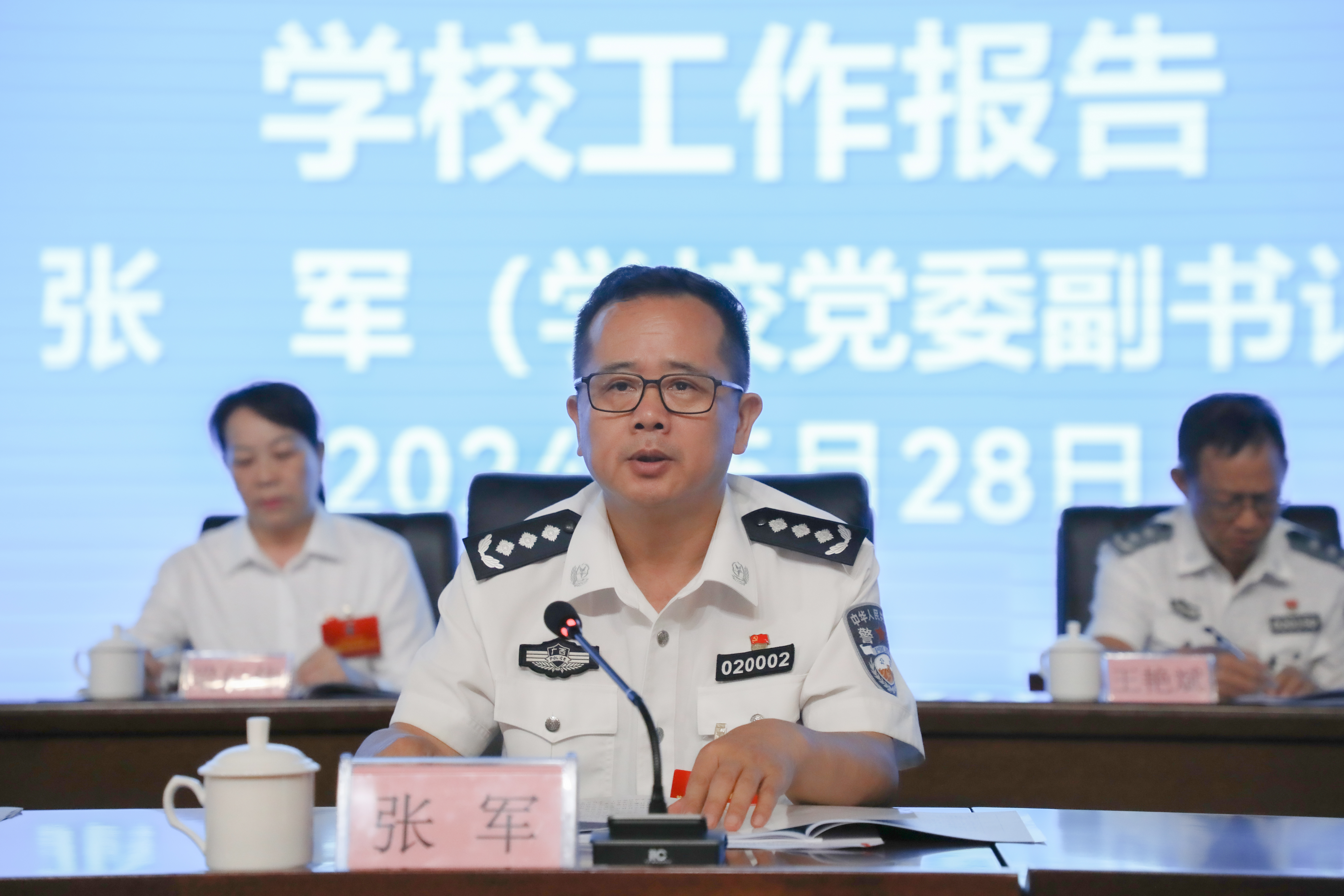 学校党委副书记、校长张军向大会作题为《深入贯彻落实习近平总书记对广西重大方略要求 巩固拓展评建工作成果 奋力推动学校高质量发展》的报告。报告总结了过去一年学校深入学习贯彻习近平新时代中国特色社会主义思想,坚持和加强党对公安教育的全面领导、绝对领导;聚焦本科教学工作合格评估中心工作,全面落实立德树人根本任务;融入“创人民满意公安”大局,主动服务平安广西、法治广西建设;积极履行社会服务职能,提升社会服务品质等方面取得的丰硕成果,深入分析合格评估后学校发展面临的新形势、新挑战。