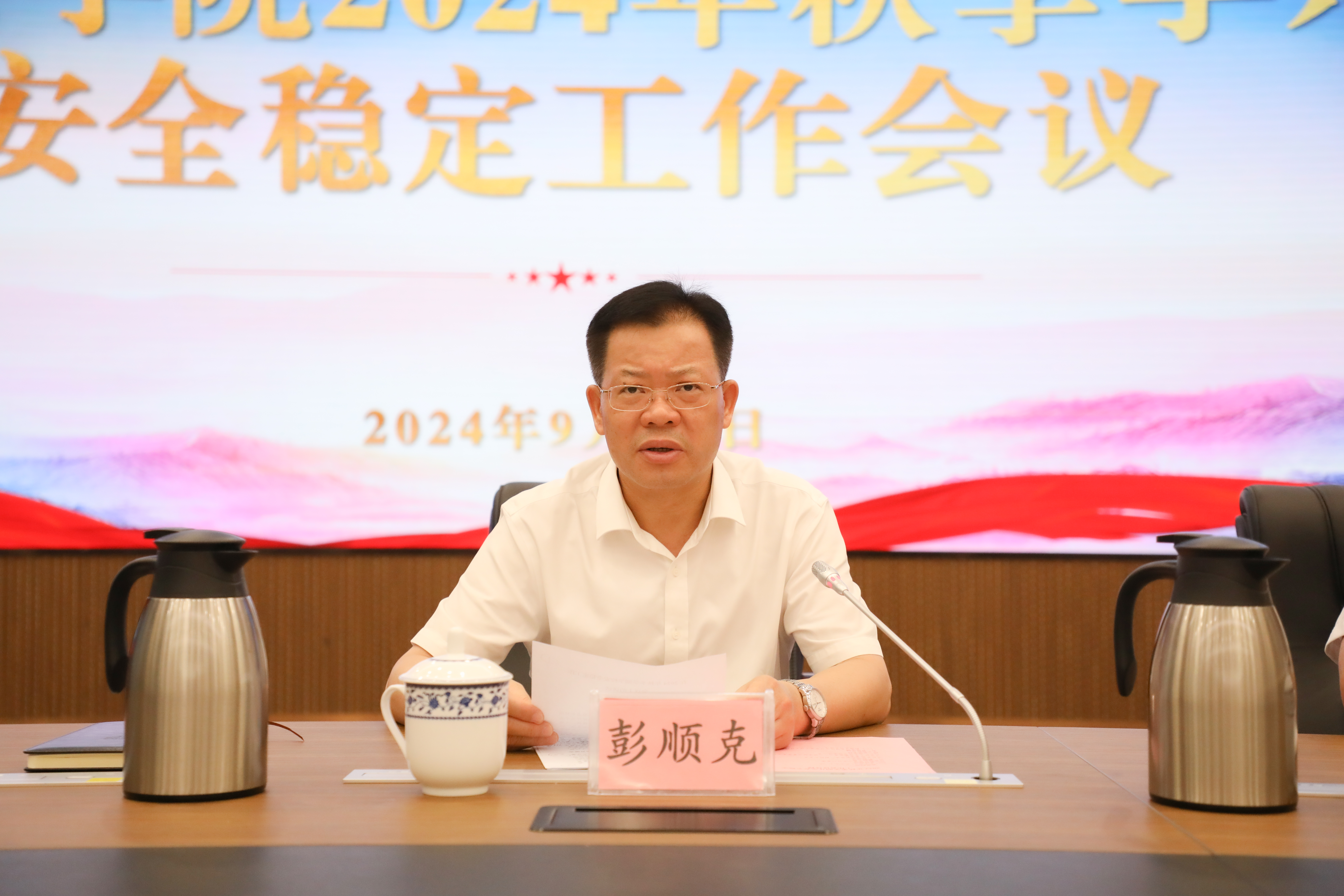 彭顺克对扎实做好学校保安全、防风险、护稳定各项工作进行部署,他提出3点要求:一是提高政治站位、扛起政治责任,切实增强做好安全稳定工作的责任感和紧迫感。坚持系统思维、筑牢安全底线,发挥好公安院校在维护校园安全稳定方面的示范引领作用,营造安全稳定的校园环境。二是坚持问题导向、突出重点任务,全面开展安全稳定风险隐患排查整治。全校各部门要密切协同配合、加强防范管理、形成工作合力,下大力气从严从实从细抓好排查整治,加强师生安全教育,落实好有关制度,全面消除各领域风险隐患。三是加强组织领导、完善体制机制,压实扣紧安全稳定工作责任链条。各单位要切实扛起安全责任,畅通信息上报渠道,严肃追责问责,以“时时放心不下”的责任感将安全稳定工作落实到位。