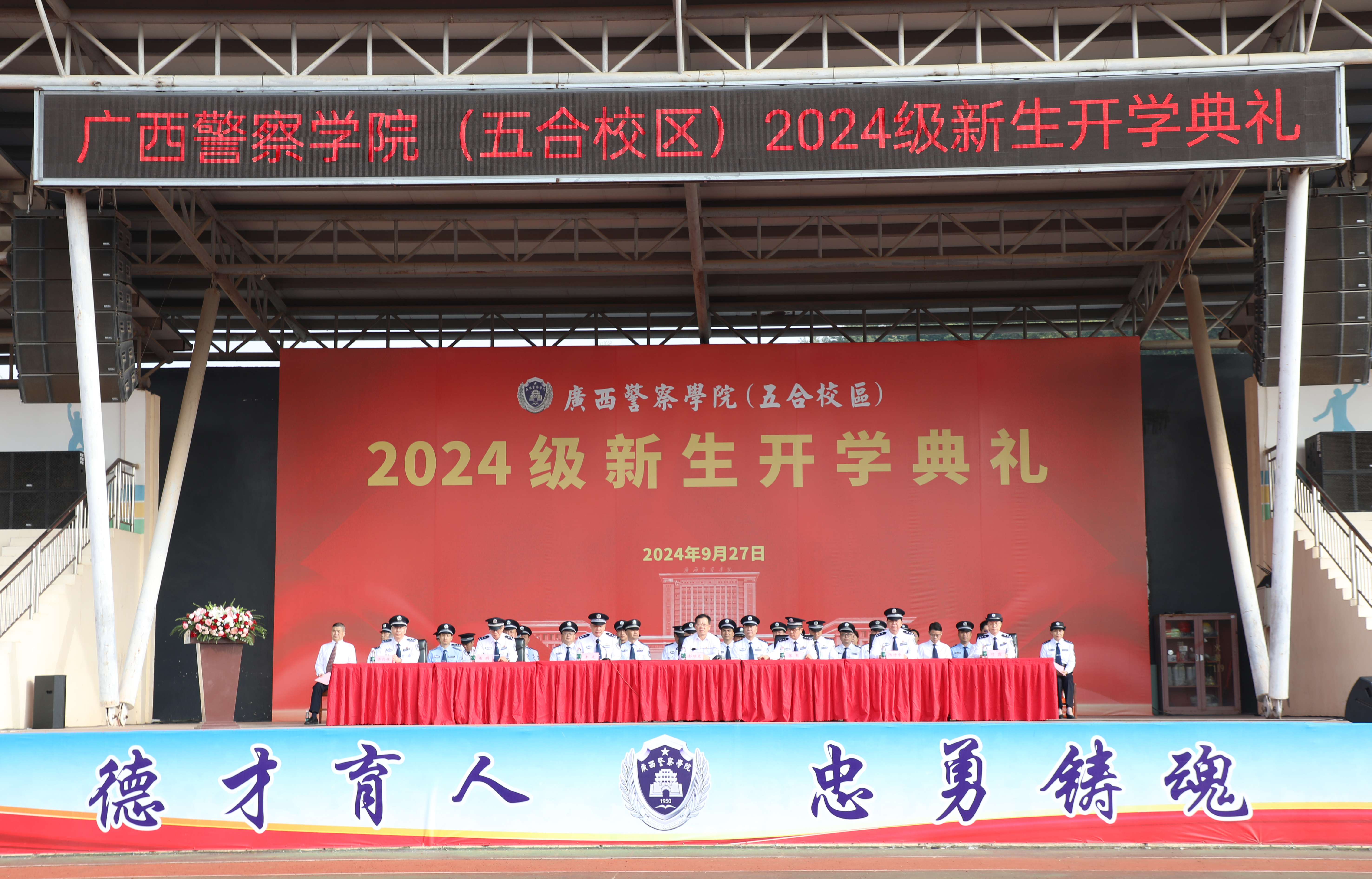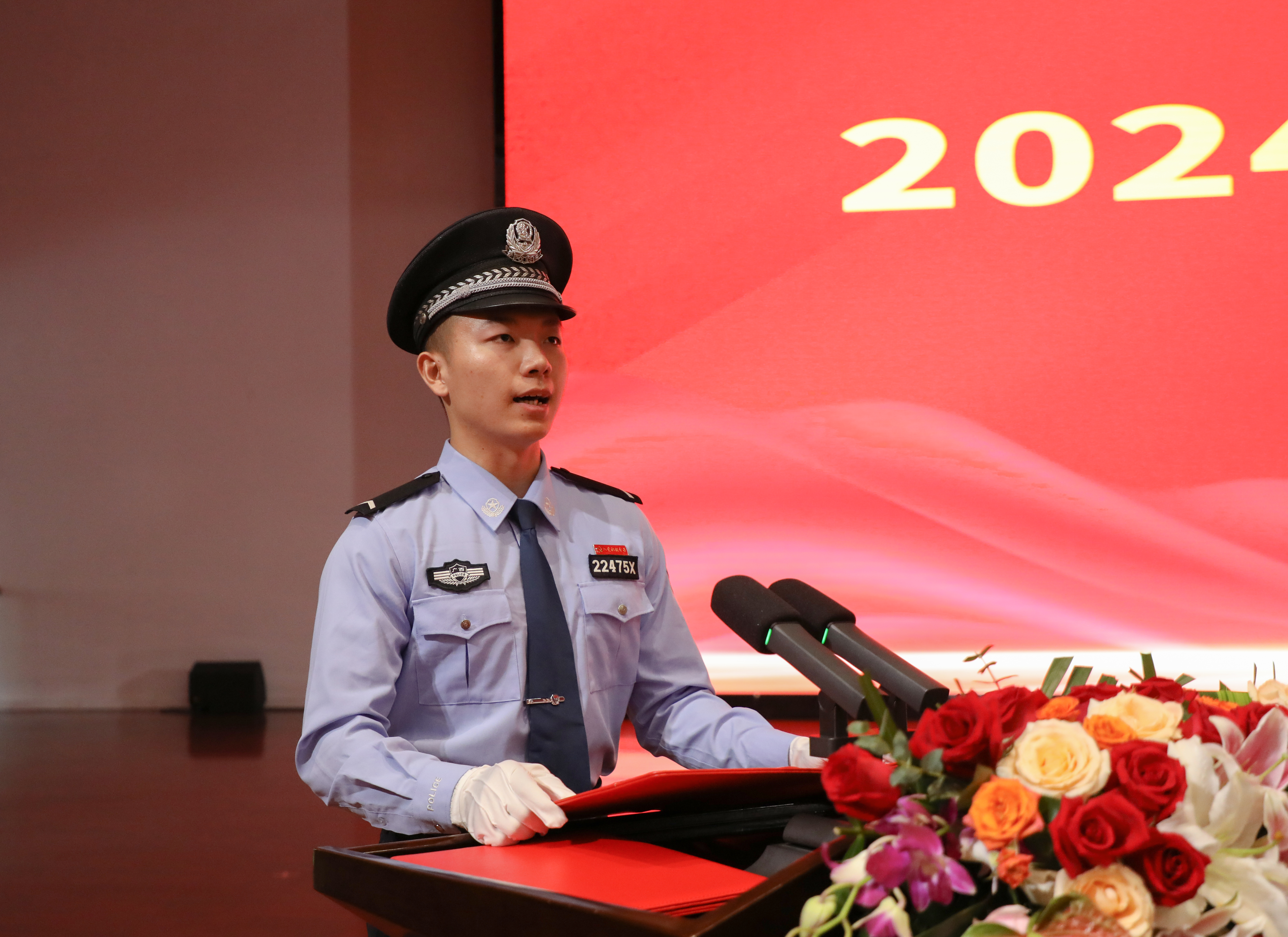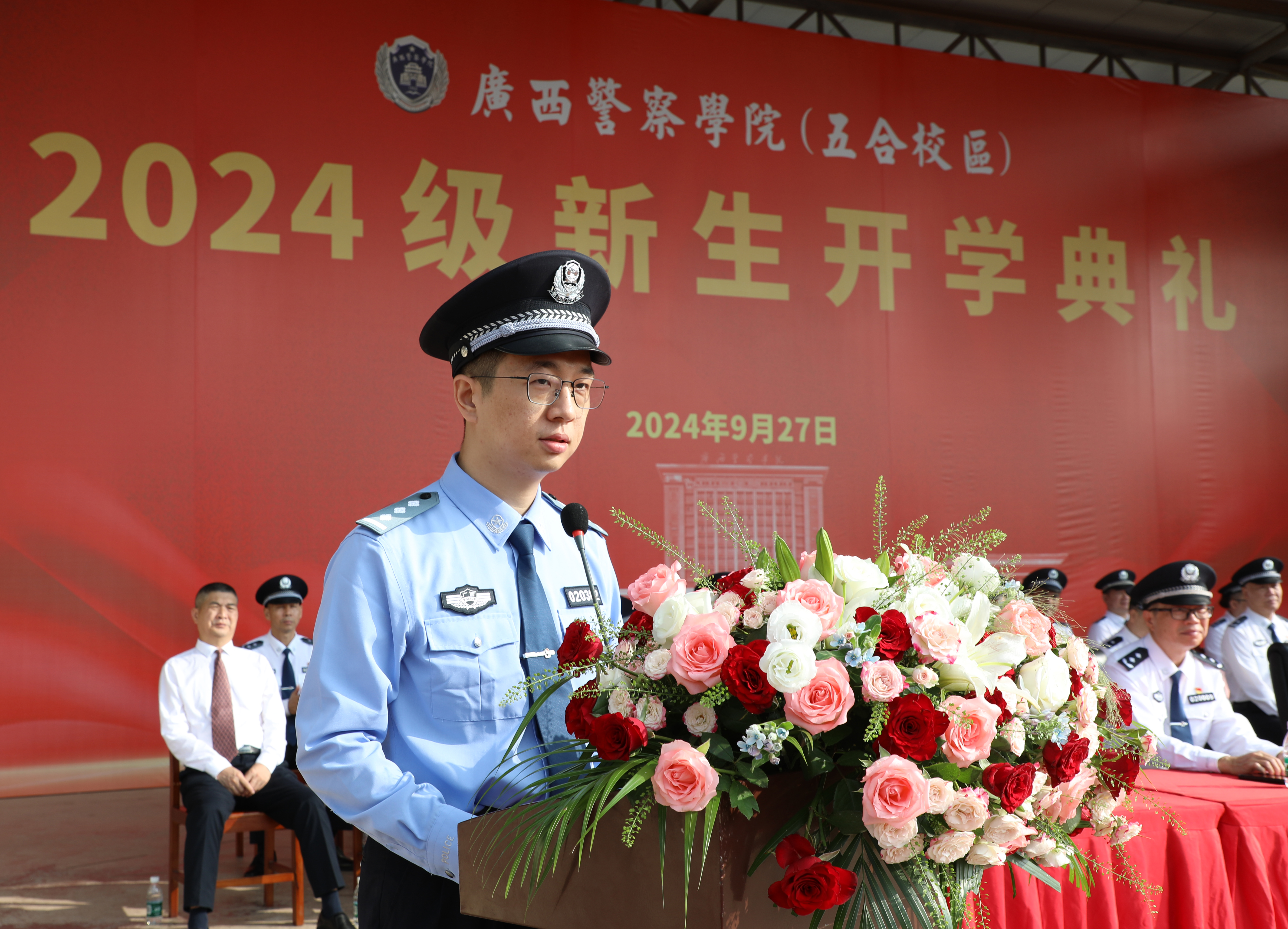高年级学生代表黄书豪、刘入铨发言,分享了他们在学校的成长和收获,鼓舞新同学要志存高远,坚定信念,勤学善思,砺炼本领,修身养性,锤炼品格,担当责任,服务社会,在警院的沃土上书写更加灿烂的青春篇章。