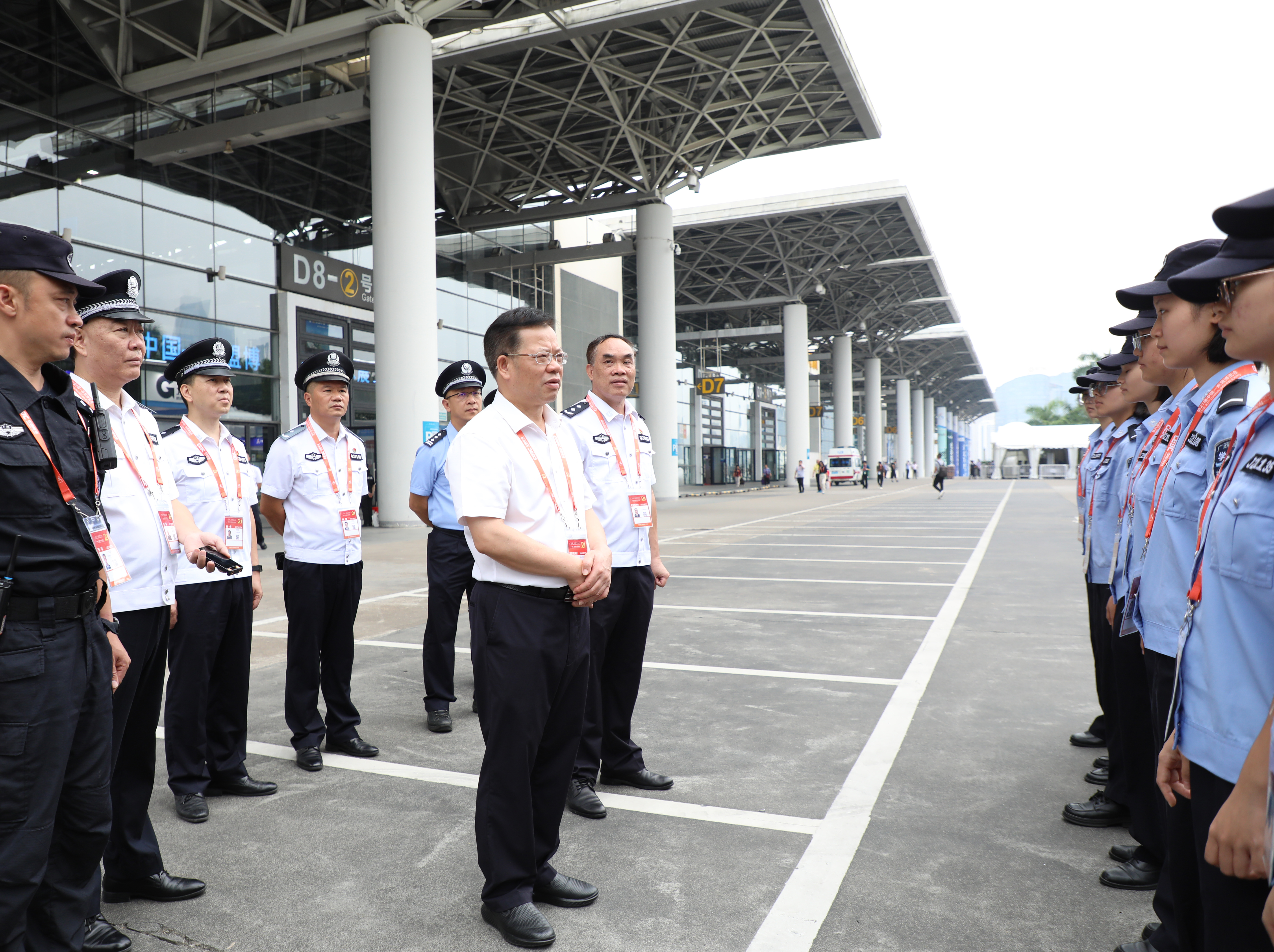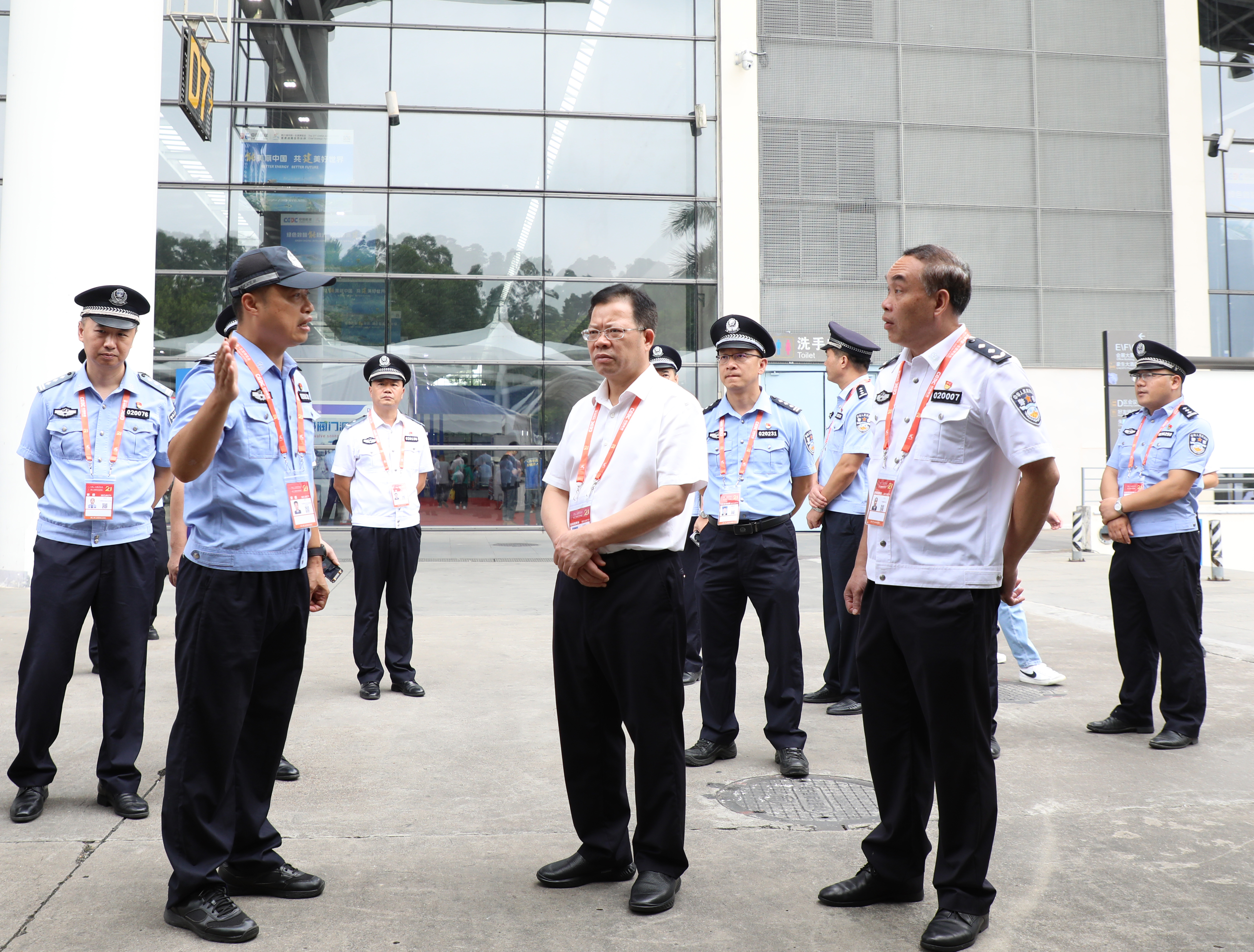 彭顺克来到南宁国际会展中心,详细了解了安检、人员部署和后勤保障等工作,向带队民警表示感谢,并与执勤师生进行交流。