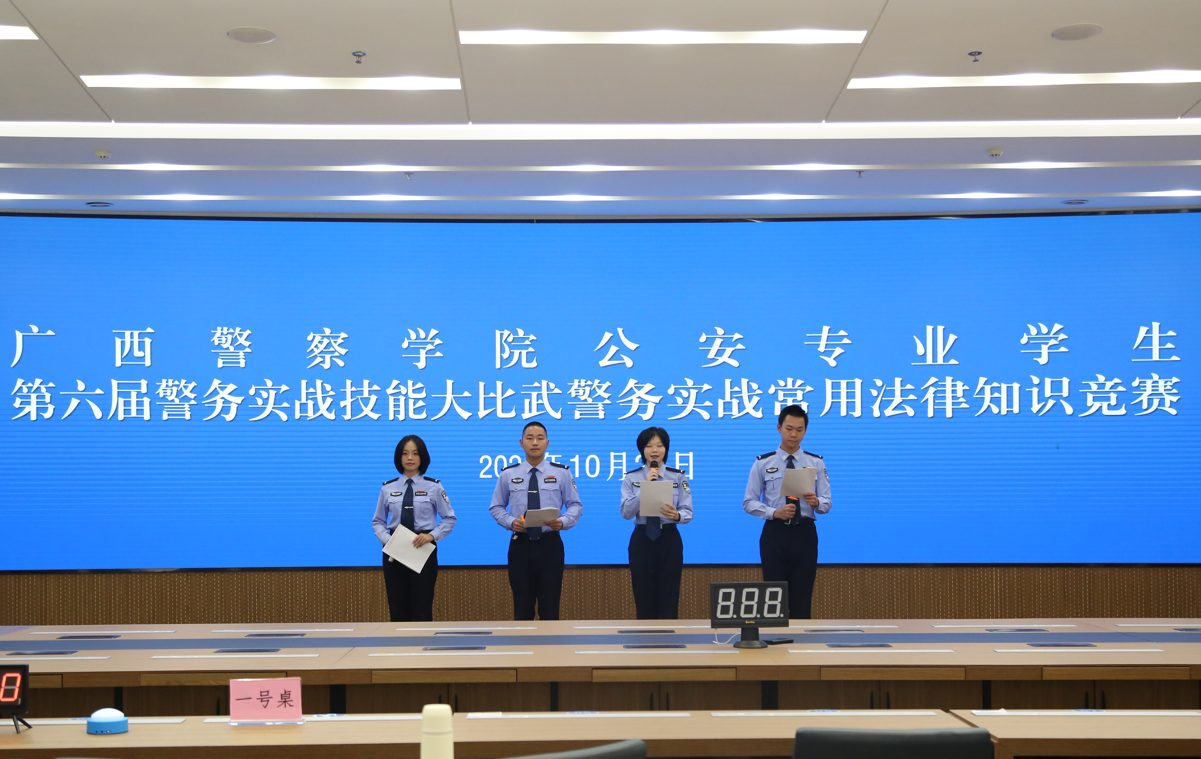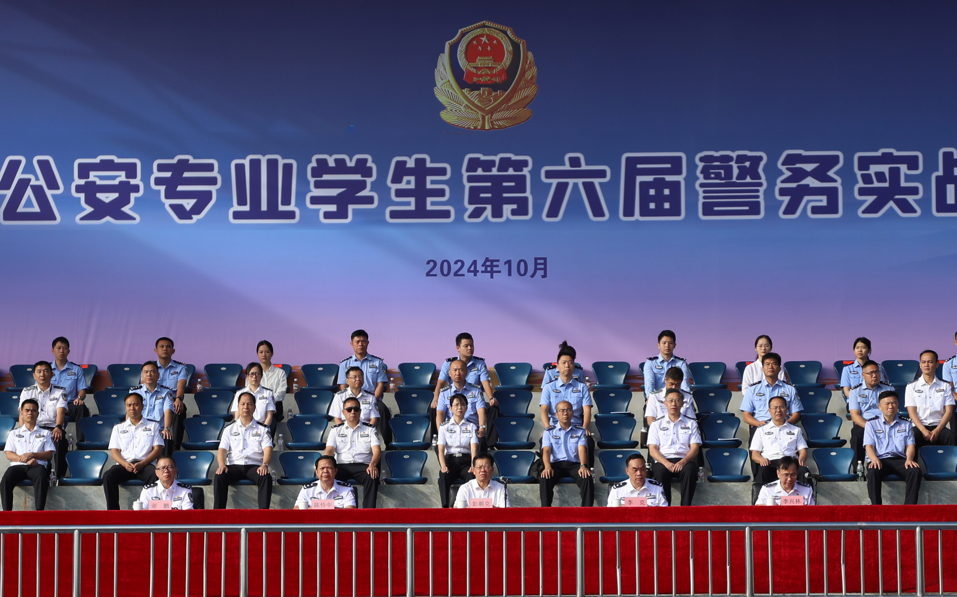 为进一步贯彻落实全国、全区公安工作会议精神,聚焦实战练兵,提升学校公安专业学生警务实战技能,锤炼过硬本领,磨炼意志品质,打造“四个铁一般”的预备警官队伍,学校于10月25日至26日举办公安专业学生第六届警务实战大比武。10月25日上午,大比武开赛仪式在仙葫校区田径运动场举行,学校党委书记彭顺克出席并宣布本届公安专业学生警务实战技能大比武开赛。副校长李克,学校党委委员、副校长陈恃中,学校党委委员、副校长谢鹏,副校长李兴林出席开赛仪式。