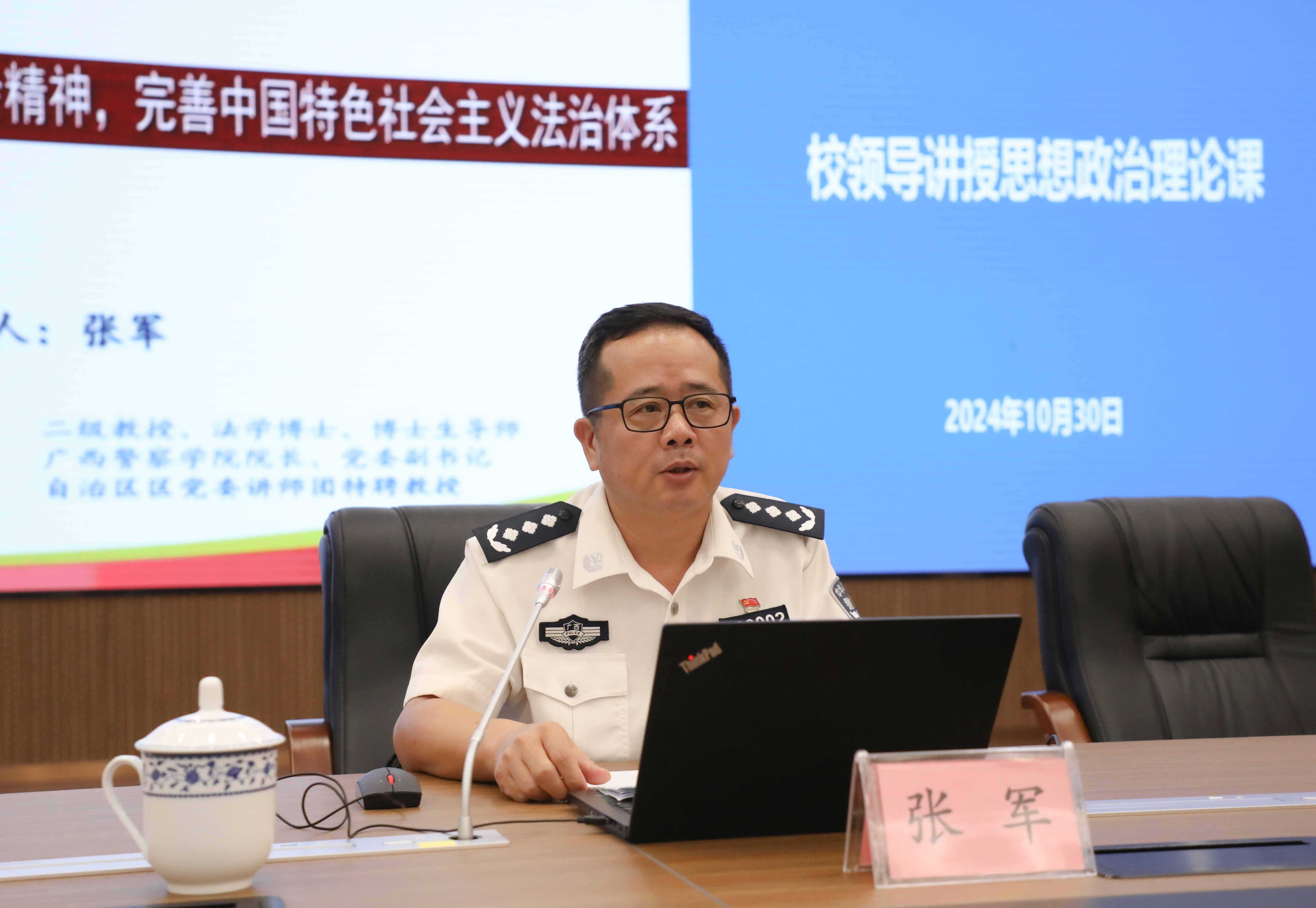为深入学习贯彻党的二十届三中全会精神和习近平总书记关于学校思政课建设的重要指示精神,贯彻落实新时代学校思政课建设推进会精神,深入践行立德树人的根本任务,10月30日,学校党委副书记、校长张军在仙葫校区智慧公安研训基地为学生讲授思想政治理论课。