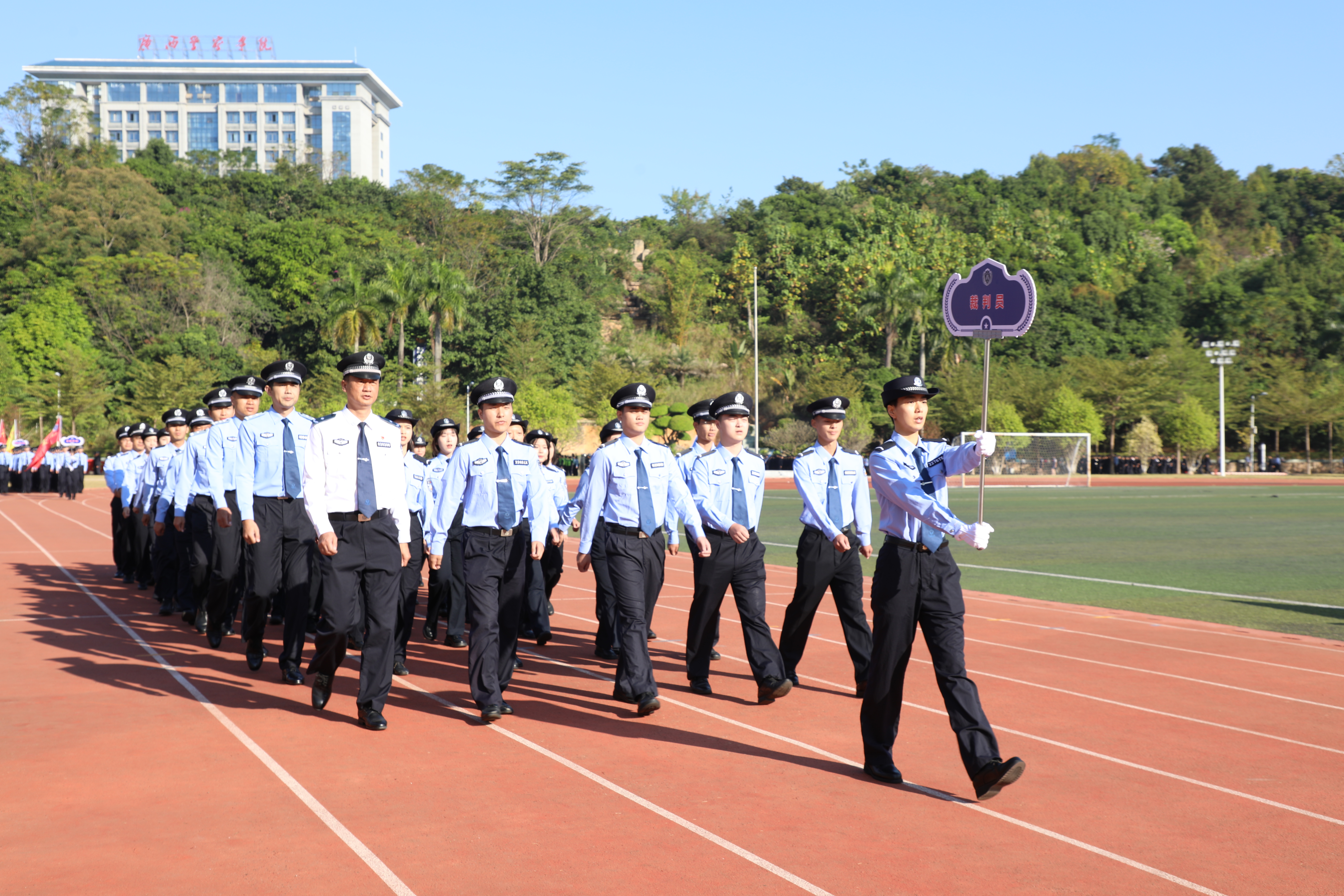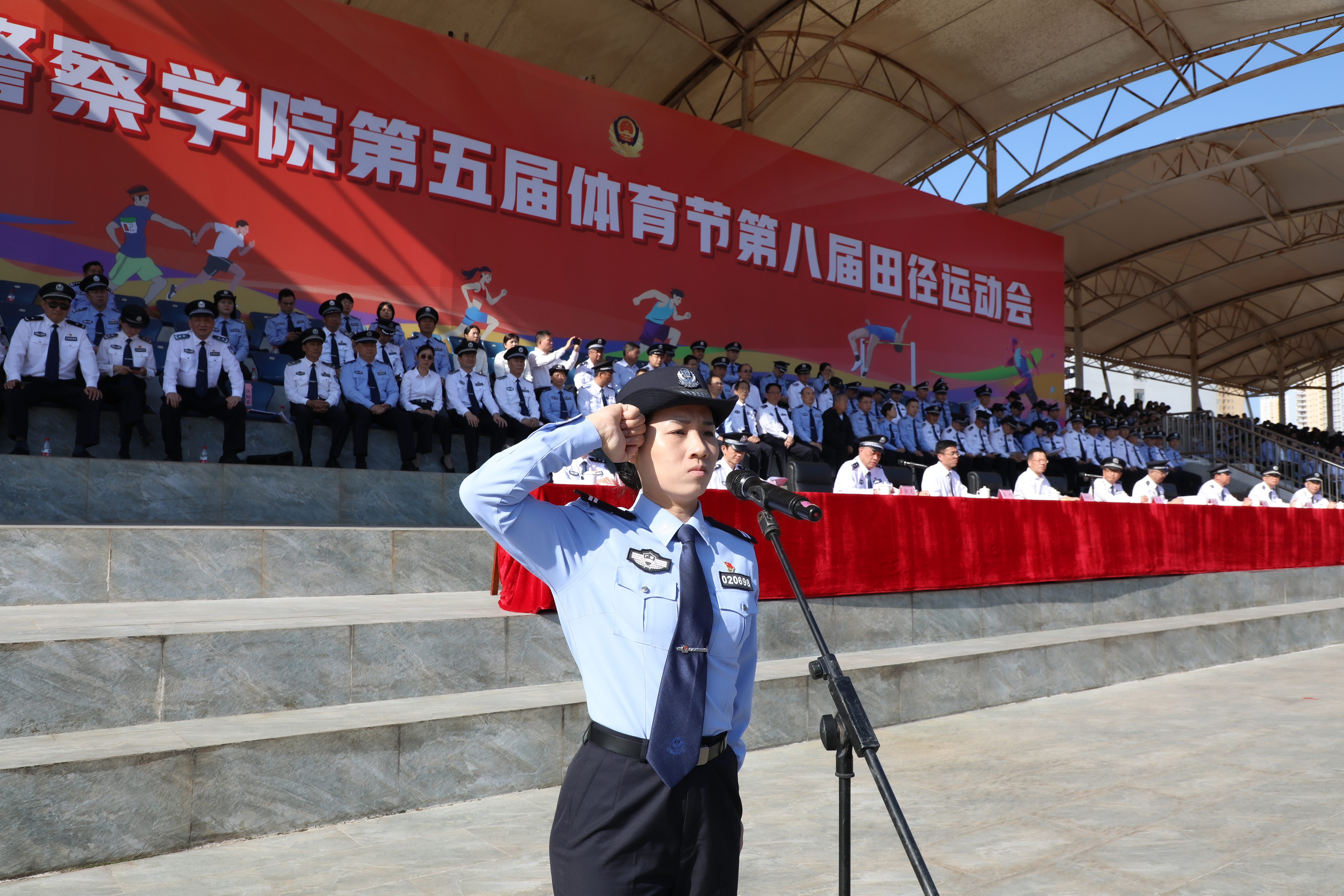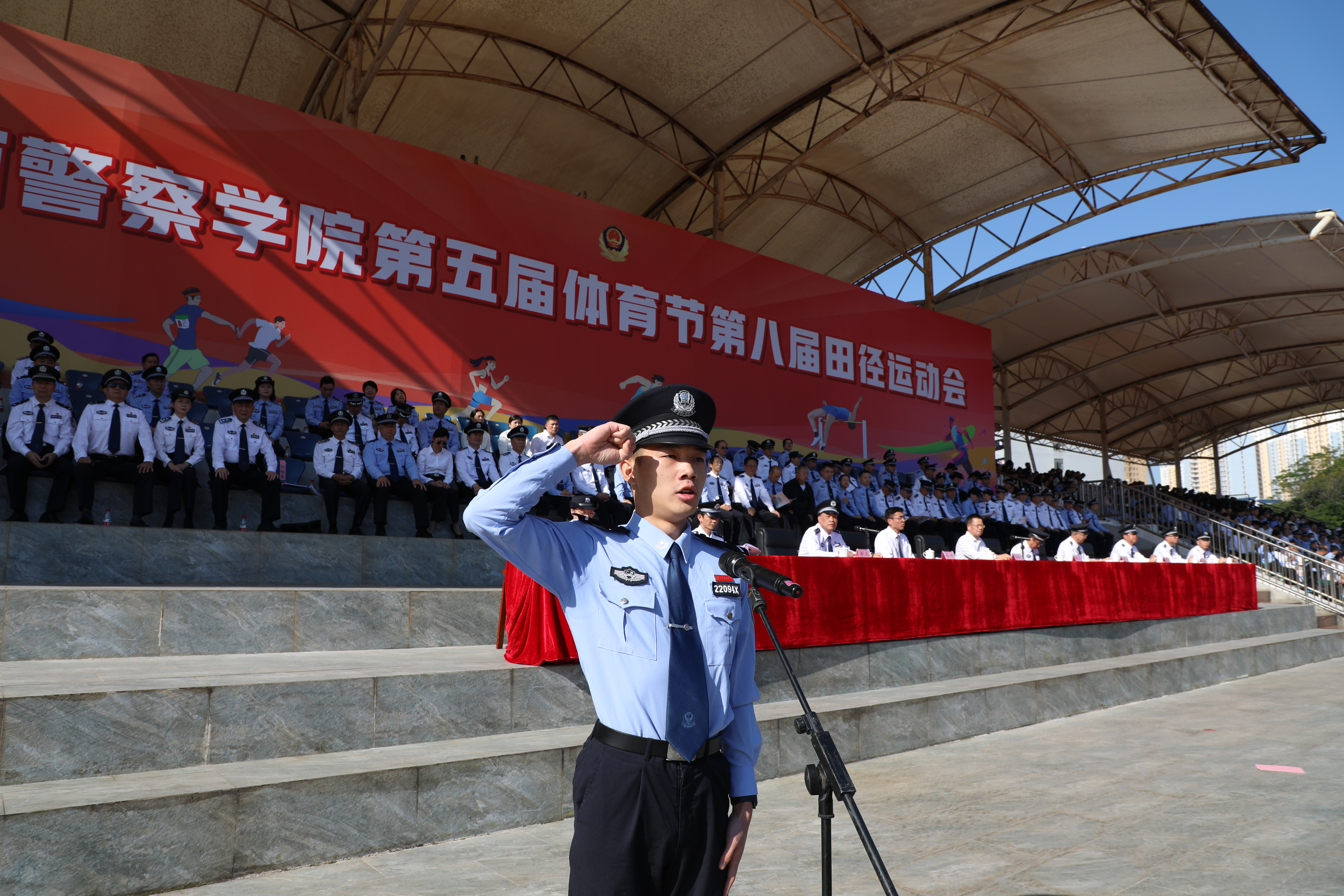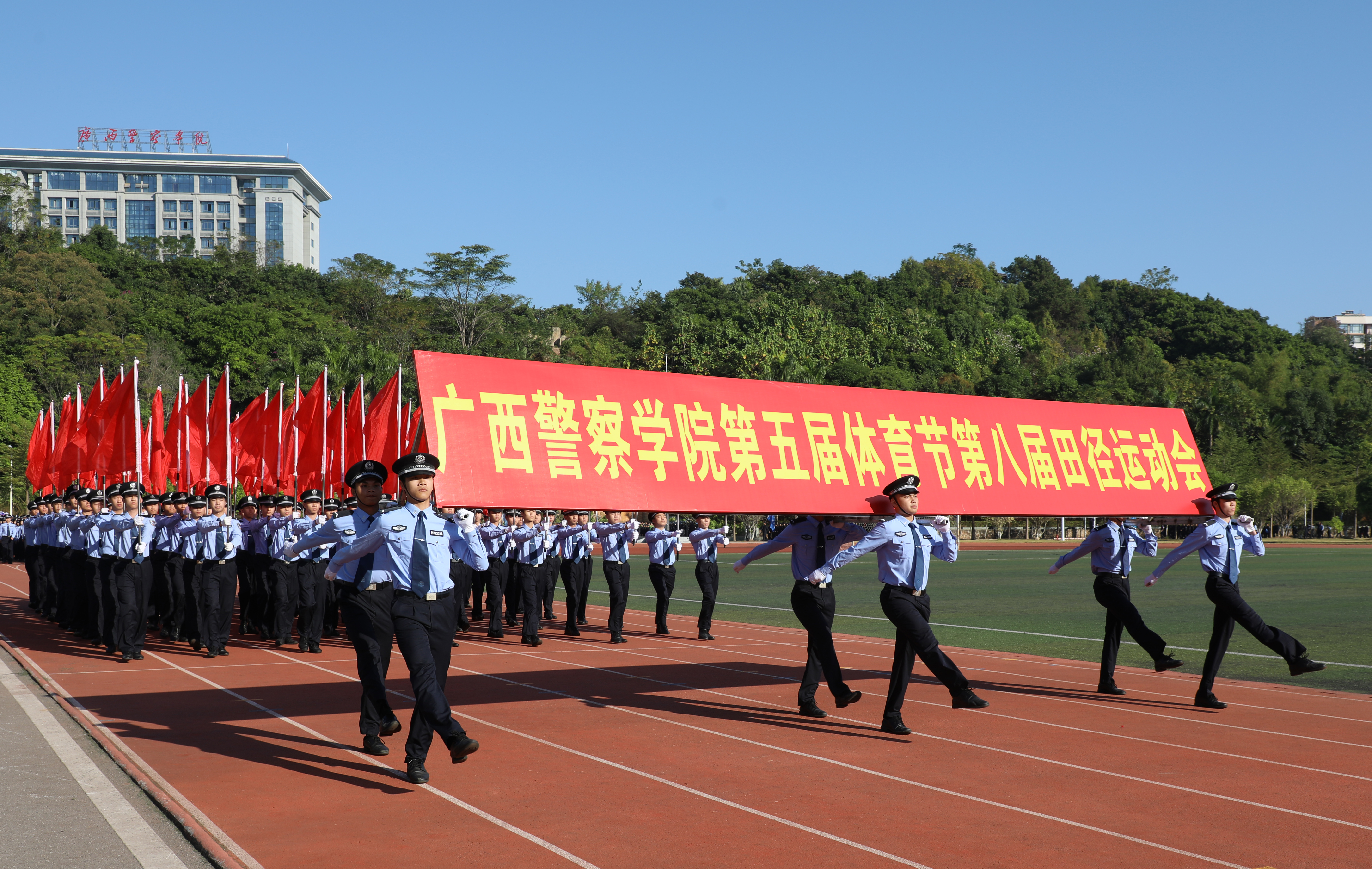 在运动员入场环节,伴随着昂扬的进行曲,国旗、警旗、警徽方阵率先迈着铿锵的步伐,昂首阔步朝主席台走来。会标方阵、红旗方块队、裁判方块队和9个二级学院方块队依次入场。整齐的队伍、有力的步伐、响亮的口号、充满创意的入场表演,展现了师生昂扬向上的精神面貌,赢得了阵阵掌声。