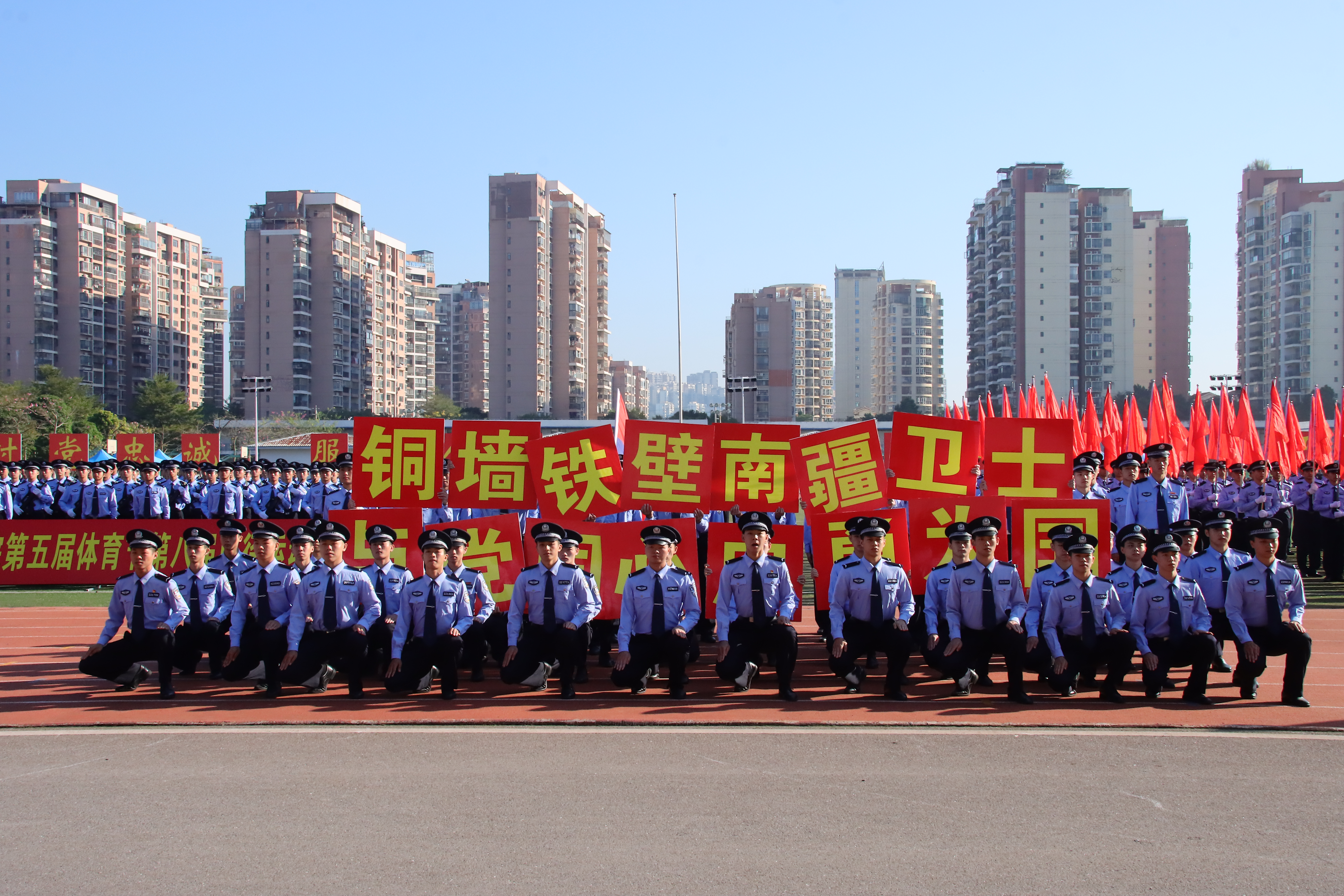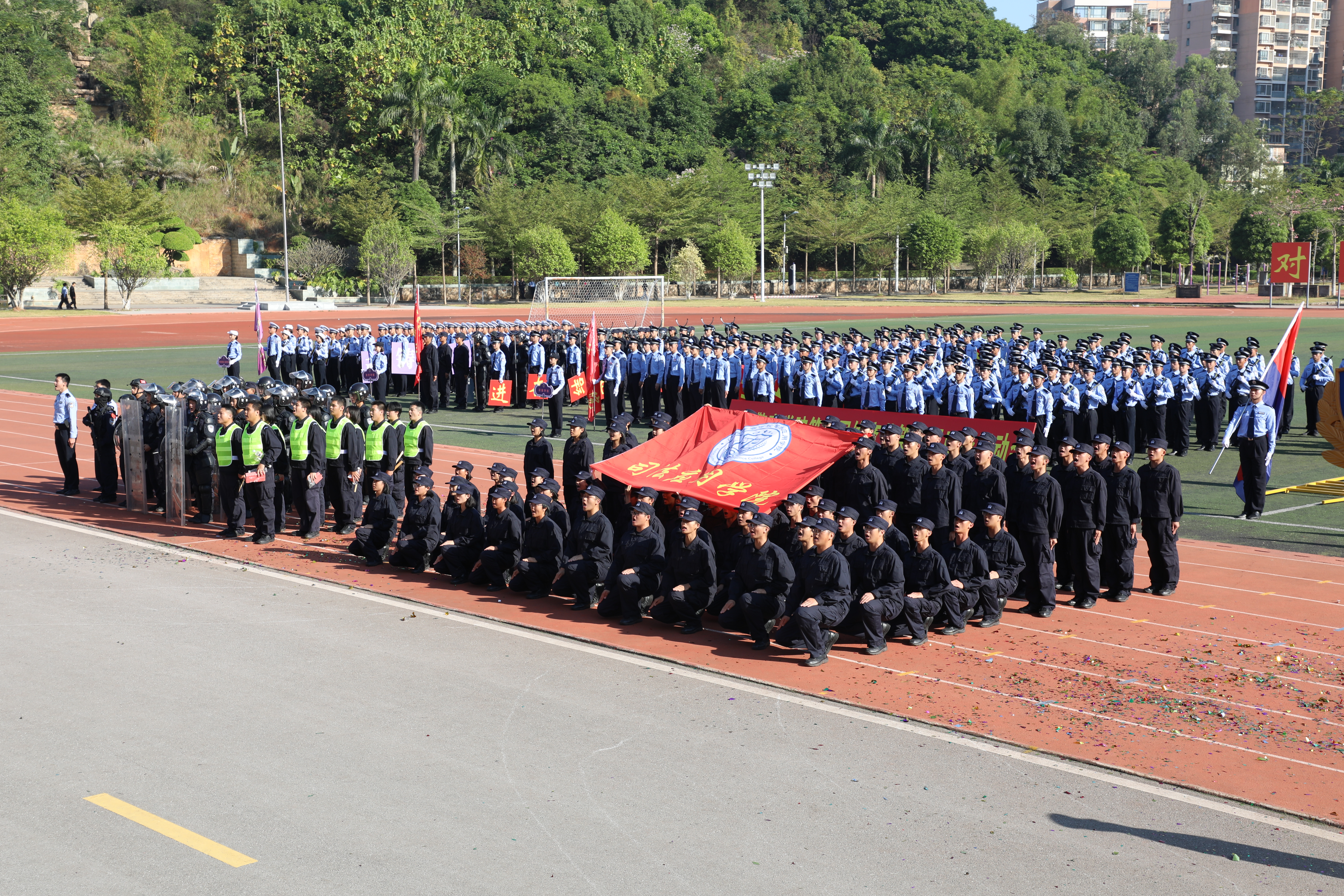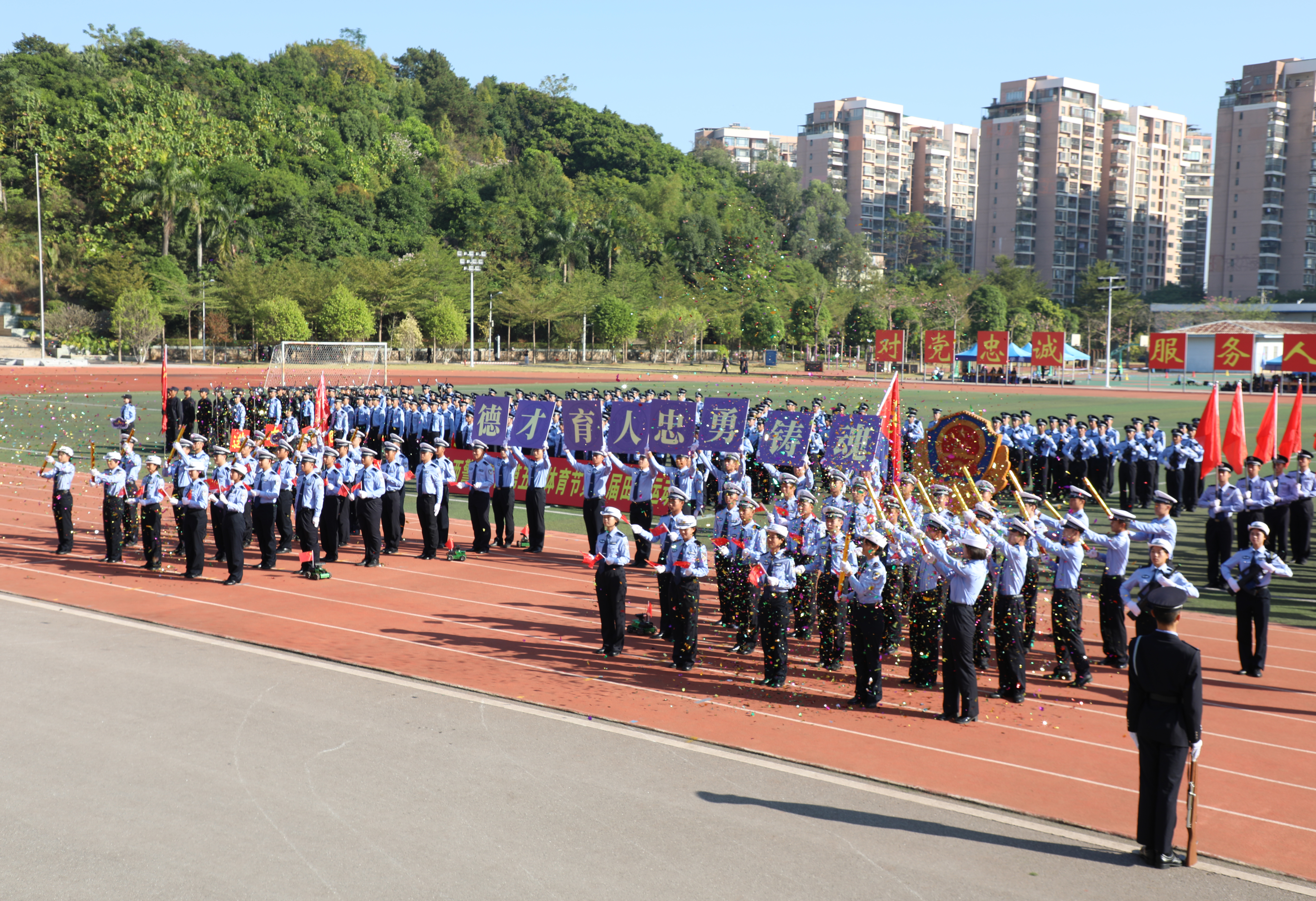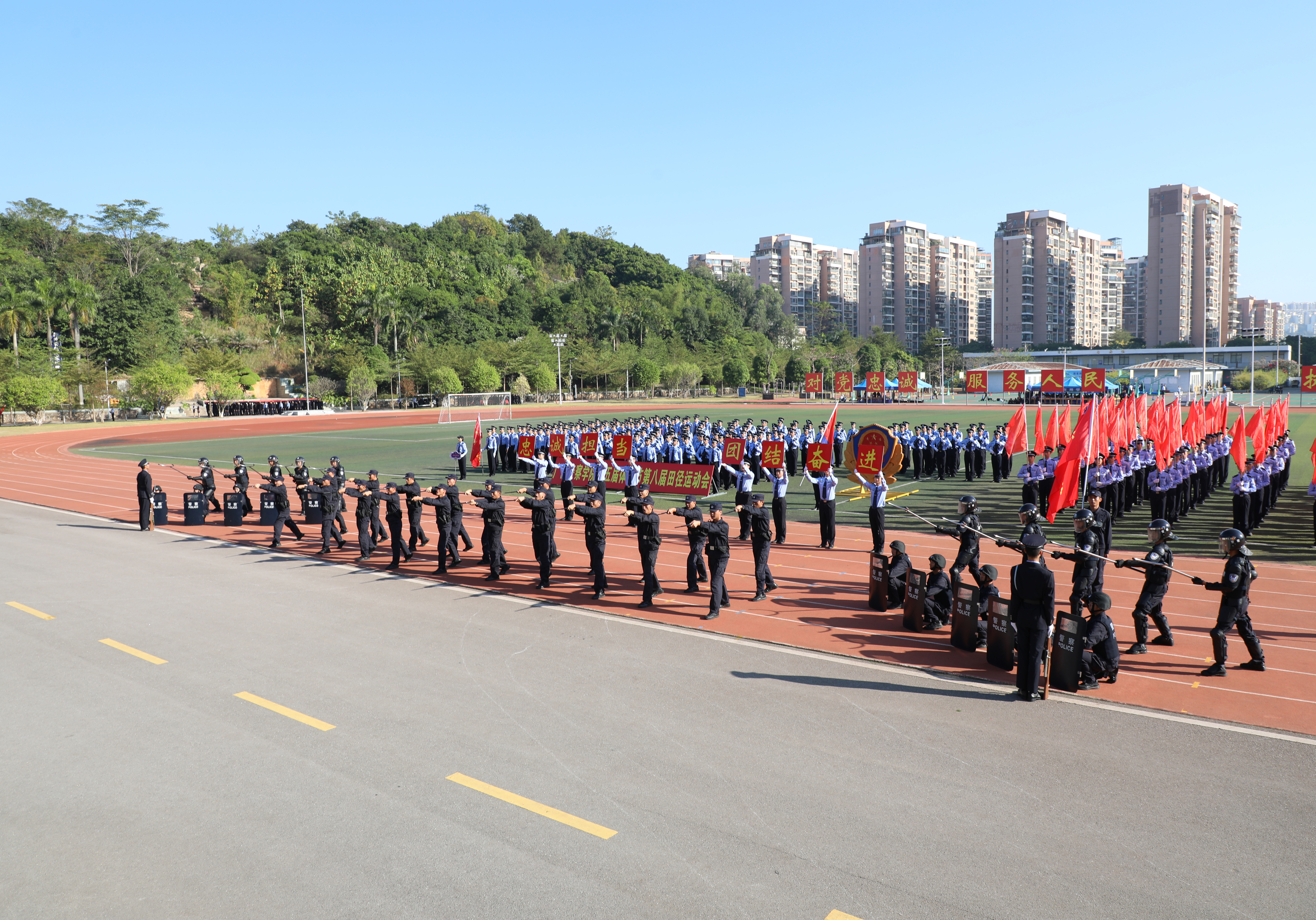 在运动员入场环节,伴随着昂扬的进行曲,国旗、警旗、警徽方阵率先迈着铿锵的步伐,昂首阔步朝主席台走来。会标方阵、红旗方块队、裁判方块队和9个二级学院方块队依次入场。整齐的队伍、有力的步伐、响亮的口号、充满创意的入场表演,展现了师生昂扬向上的精神面貌,赢得了阵阵掌声。